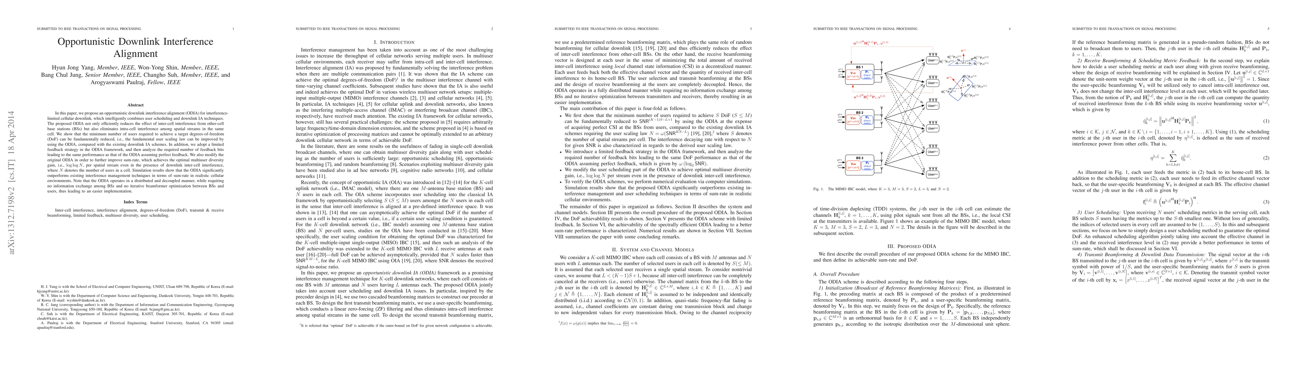 This paper proposes Opportunistic Downlink Interference Alignment (ODIA) to reduce inter-cell and intra-cell interference in cellular networks, achieving improved user scaling laws and optimal multiuser diversity gain. Simulation results show significant sum-rate improvements over existing techniques, with a distributed implementation requiring no inter-base station information exchange.