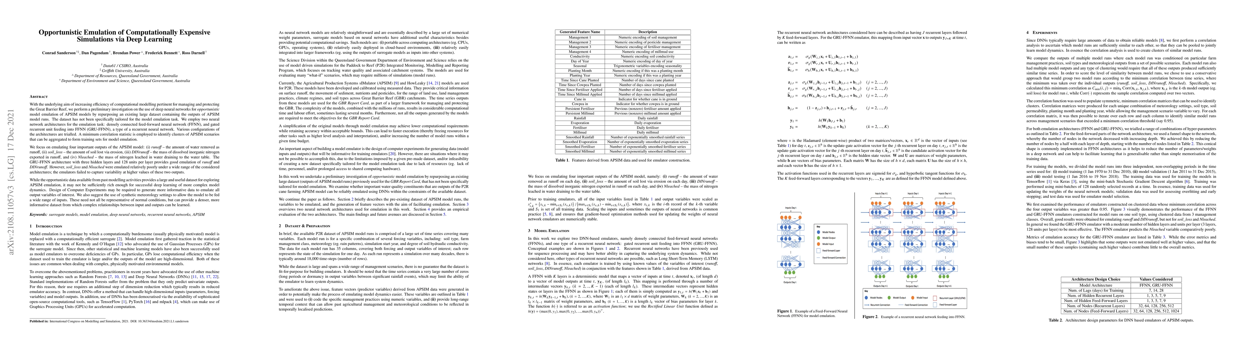 This paper investigates the use of deep learning to emulate computationally expensive APSIM models for managing the Great Barrier Reef, employing FFNN and GRU-FFNN architectures. The GRU-FFNN architecture shows good performance for emulating runoff and DINrunoff, but struggles with soil_loss and Nleached, suggesting the need for more informative data and synthetic meteorology settings for better emulation.