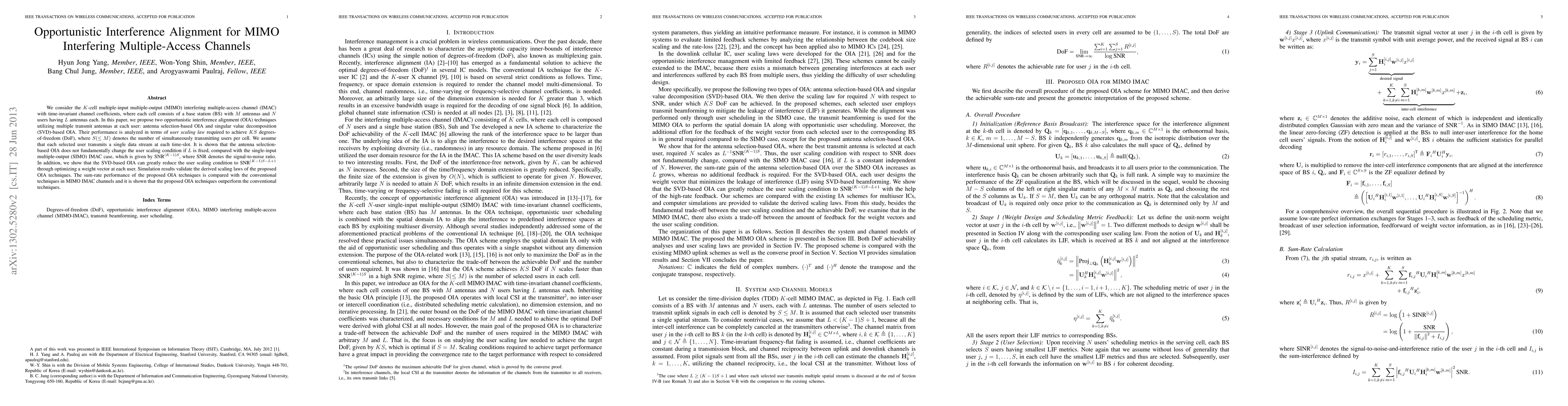 This paper proposes two opportunistic interference alignment techniques for MIMO interfering multiple-access channels: antenna selection-based and SVD-based OIA. The SVD-based method significantly reduces the required user scaling condition, outperforming conventional techniques in sum-rate performance.