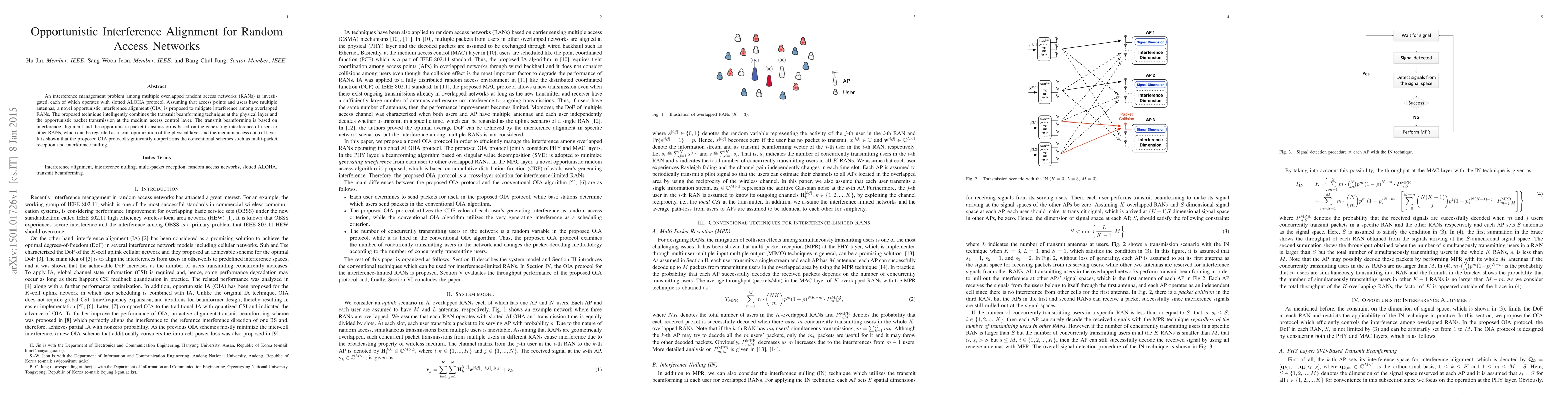 A novel opportunistic interference alignment protocol was proposed for overlapped random access networks operating with slotted ALOHA.