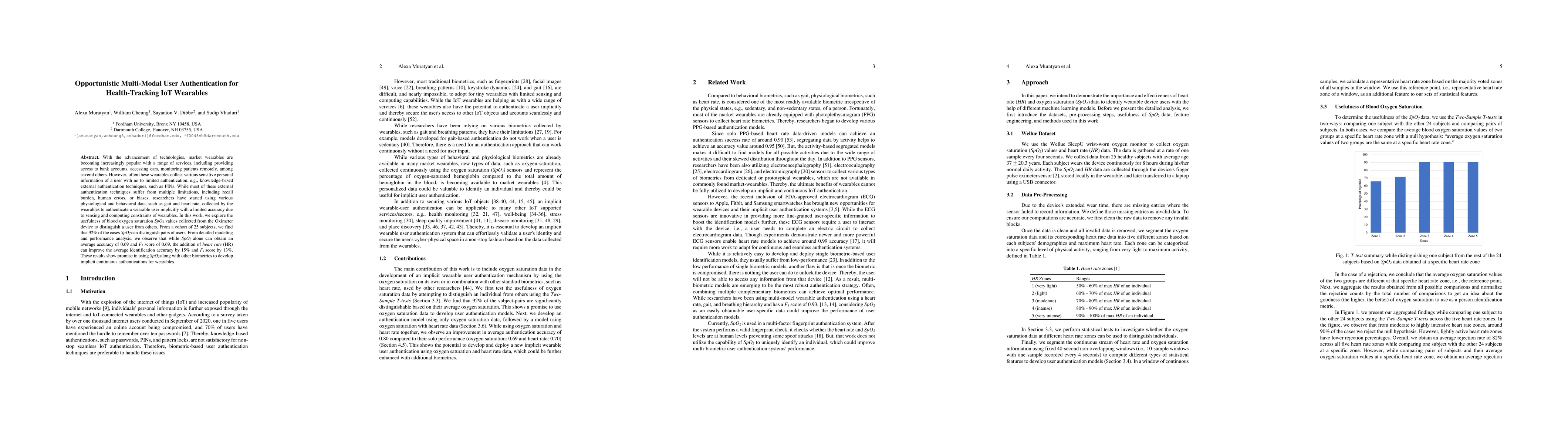 With the advancement of technologies, market wearables are becoming increasingly popular with a range of services, including providing access to bank accounts, accessing cars, monitoring patients remotely, among several others. However, often these wearables collect various sensitive personal information of a user with no to limited authentication, e.g., knowledge-based external authentication techniques, such as PINs. While most of these external authentication techniques suffer from multiple limitations, including recall burden, human errors, or biases, researchers have started using various physiological and behavioral data, such as gait and heart rate, collected by the wearables to authenticate a wearable user implicitly with a limited accuracy due to sensing and computing constraints of wearables. In this work, we explore the usefulness of blood oxygen saturation SpO2 values collected from the Oximeter device to distinguish a user from others. From a cohort of 25 subjects, we find that 92% of the cases SpO2 can distinguish pairs of users. From detailed modeling and performance analysis, we observe that while SpO2 alone can obtain an average accuracy of 0.69 and F1 score of 0.69, the addition of heart rate (HR) can improve the average identification accuracy by 15% and F1 score by 13%. These results show promise in using SpO2 along with other biometrics to develop implicit continuous authentications for wearables.