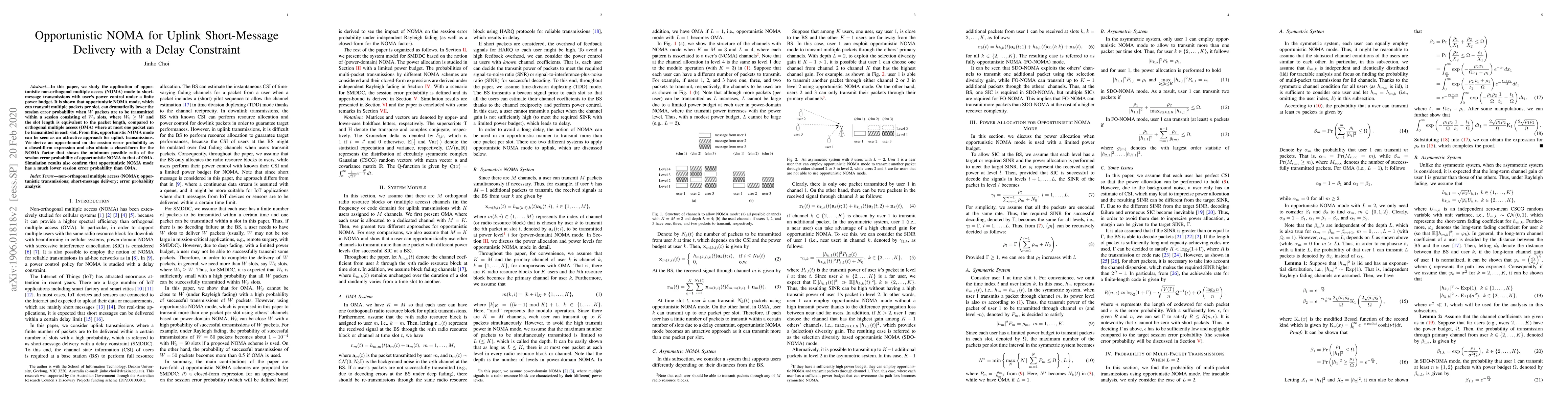 This paper explores the use of opportunistic NOMA for uplink short-message delivery under a delay constraint, demonstrating that it can significantly reduce session error probability compared to OMA. It derives closed-form expressions for session error probability and the NOMA factor, and shows through simulations that opportunistic NOMA outperforms OMA.