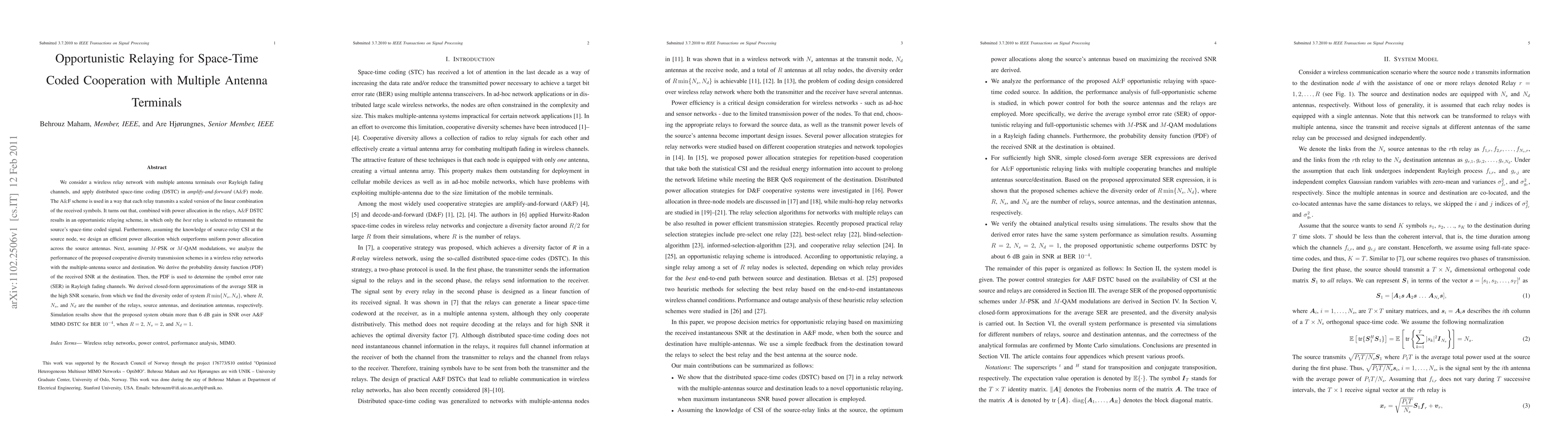 We consider a wireless relay network with multiple antenna terminals over Rayleigh fading channels, and apply distributed space-time coding (DSTC) in amplify-and-forward (A&F) mode. The A&F scheme is used in a way that each relay transmits a scaled version of the linear combination of the received symbols. It turns out that, combined with power allocation in the relays, A&F DSTC results in an opportunistic relaying scheme, in which only the best relay is selected to retransmit the source's space-time coded signal. Furthermore, assuming the knowledge of source-relay CSI at the source node, we design an efficient power allocation which outperforms uniform power allocation across the source antennas. Next, assuming M-PSK or M-QAM modulations, we analyze the performance of the proposed cooperative diversity transmission schemes in a wireless relay networks with the multiple-antenna source and destination. We derive the probability density function (PDF) of the received SNR at the destination. Then, the PDF is used to determine the symbol error rate (SER) in Rayleigh fading channels. We derived closed-form approximations of the average SER in the high SNR scenario, from which we find the diversity order of system RminfNs;Ndg, where R, Ns, and Nd are the number of the relays, source antennas, and destination antennas, respectively. Simulation results show that the proposed system obtain more than 6 dB gain in SNR over A&F MIMO DSTC for BER 10^{-4}, when R = 2, Ns = 2, and Nd = 1.