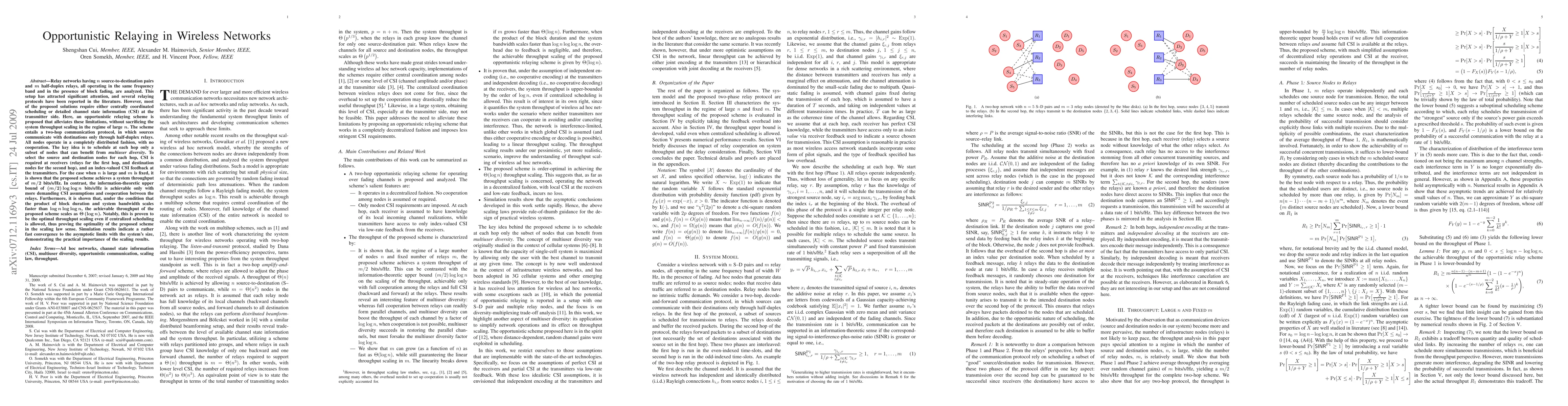 This paper proposes an opportunistic relaying scheme for wireless networks with half-duplex relays, which achieves optimal throughput scaling with $\Theta (\log n)$ bits/s/Hz without requiring centralized coordination or detailed channel state information at the transmitter. The scheme leverages multiuser diversity and only needs CSI at receivers.
