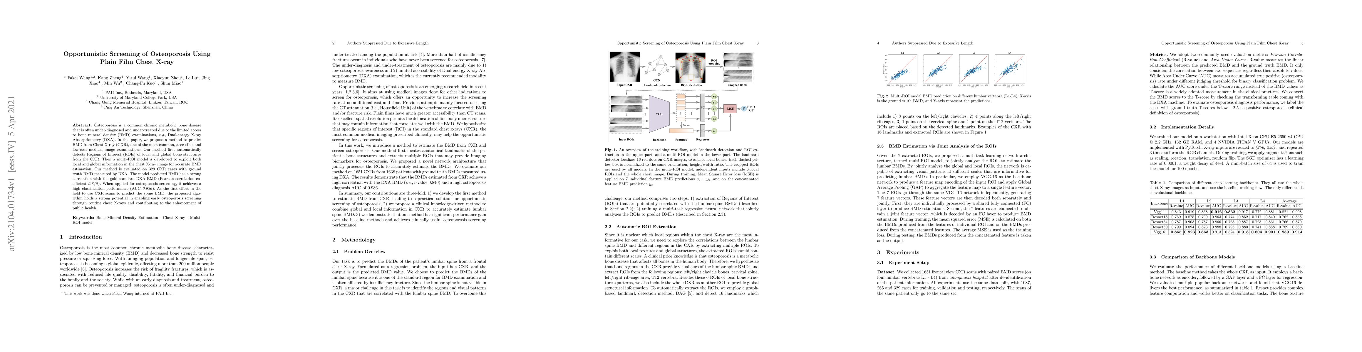 This paper proposes a method to predict bone mineral density (BMD) from plain film chest X-rays, leveraging accessible and low-cost medical imaging. The method uses automatic detection of bone structures and a multi-ROI model to estimate BMD, achieving a strong correlation with DXA measurements and high classification performance for osteoporosis screening.