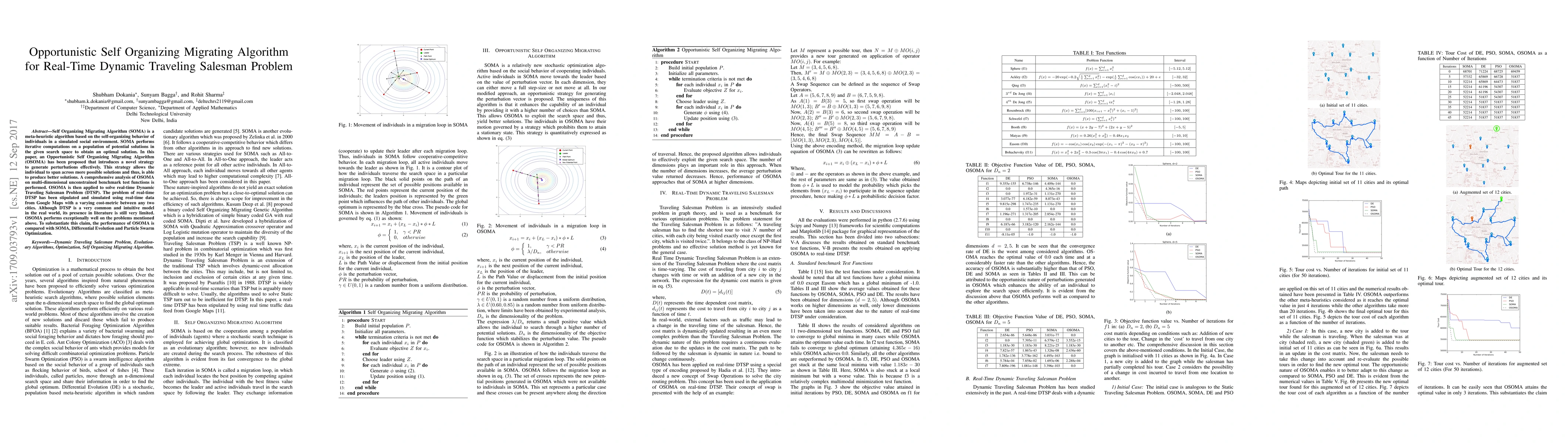 Self Organizing Migrating Algorithm (SOMA) is a meta-heuristic algorithm based on the self-organizing behavior of individuals in a simulated social environment. SOMA performs iterative computations on a population of potential solutions in the given search space to obtain an optimal solution. In this paper, an Opportunistic Self Organizing Migrating Algorithm (OSOMA) has been proposed that introduces a novel strategy to generate perturbations effectively. This strategy allows the individual to span across more possible solutions and thus, is able to produce better solutions. A comprehensive analysis of OSOMA on multi-dimensional unconstrained benchmark test functions is performed. OSOMA is then applied to solve real-time Dynamic Traveling Salesman Problem (DTSP). The problem of real-time DTSP has been stipulated and simulated using real-time data from Google Maps with a varying cost-metric between any two cities. Although DTSP is a very common and intuitive model in the real world, its presence in literature is still very limited. OSOMA performs exceptionally well on the problems mentioned above. To substantiate this claim, the performance of OSOMA is compared with SOMA, Differential Evolution and Particle Swarm Optimization.