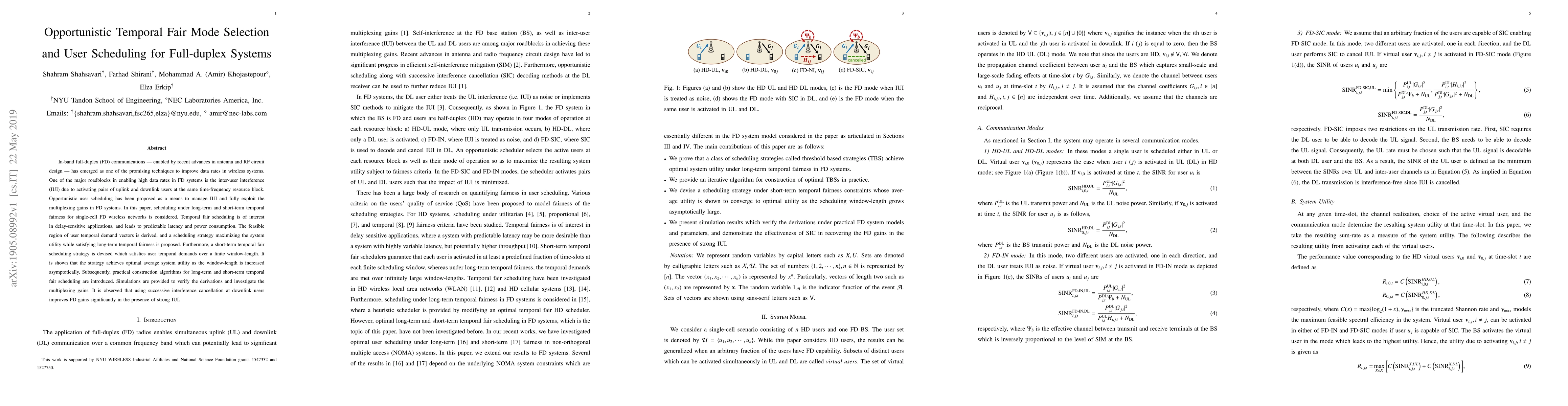 This paper proposes opportunistic user scheduling and temporal fair mode selection strategies for in-band full-duplex wireless networks to manage inter-user interference and maximize system utility. It introduces algorithms for both long-term and short-term temporal fair scheduling, demonstrating optimal average system utility as the scheduling window length increases.