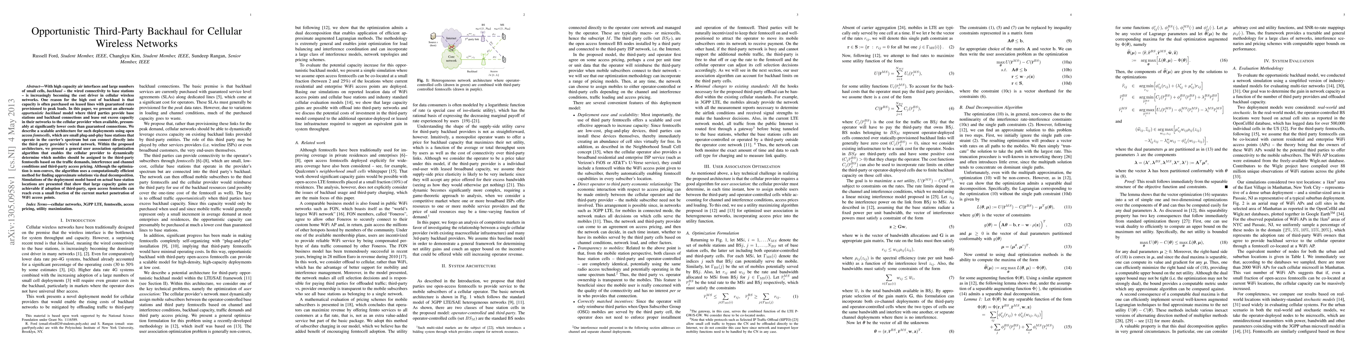 This paper proposes an opportunistic third-party backhaul model to reduce cellular network costs by leveraging excess capacity from third-party providers. The authors introduce a scalable architecture using open access femtocells and present an optimization algorithm to dynamically assign mobiles based on traffic and interference, achieving significant capacity gains.