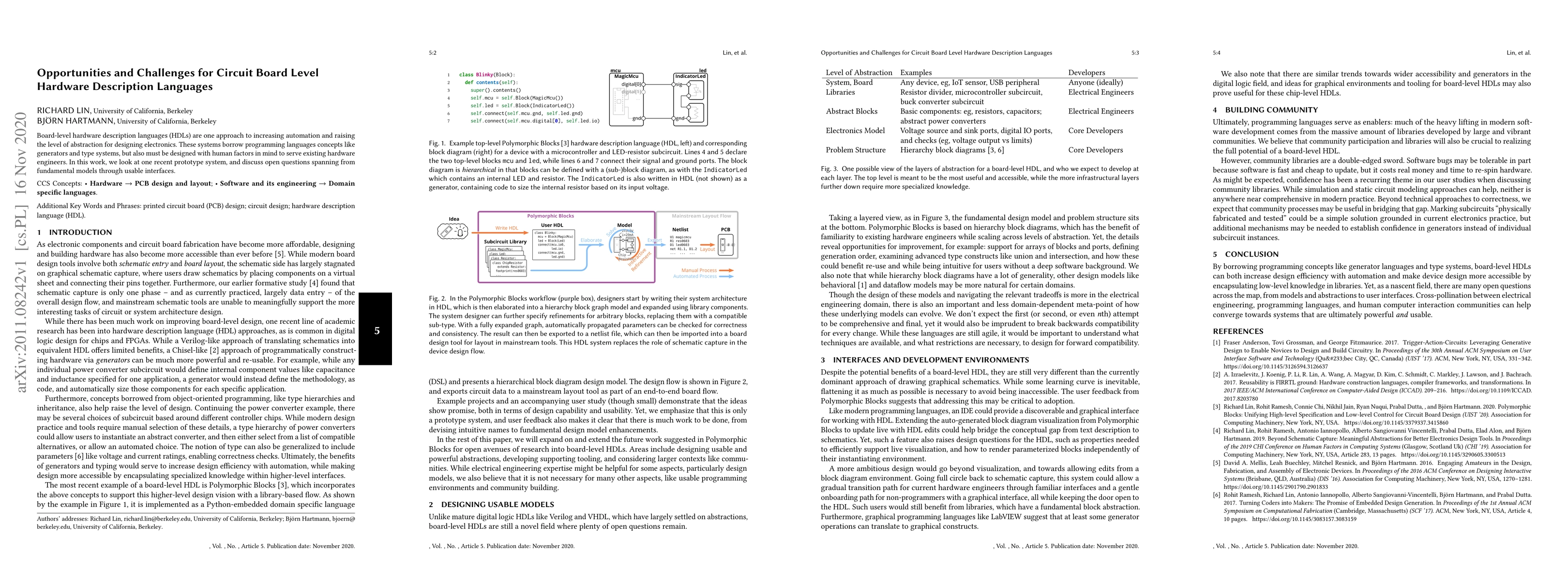 Board-level hardware description languages (HDLs) are one approach to increasing automation and raising the level of abstraction for designing electronics. These systems borrow programming languages concepts like generators and type systems, but also must be designed with human factors in mind to serve existing hardware engineers. In this work, we look at one recent prototype system, and discuss open questions spanning from fundamental models through usable interfaces.