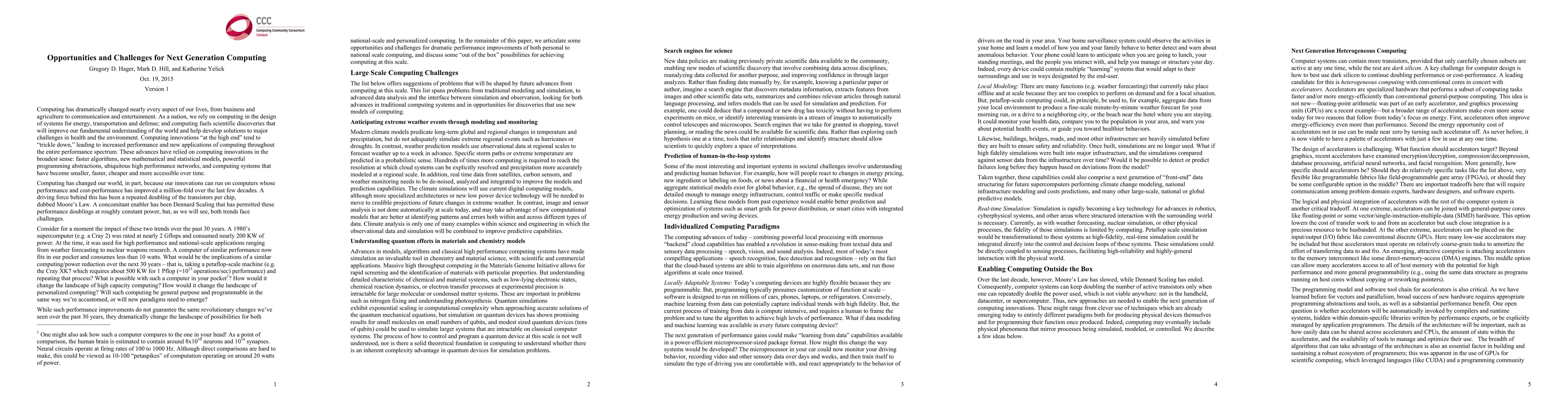 Computing has dramatically changed nearly every aspect of our lives, from business and agriculture to communication and entertainment. As a nation, we rely on computing in the design of systems for energy, transportation and defense; and computing fuels scientific discoveries that will improve our fundamental understanding of the world and help develop solutions to major challenges in health and the environment. Computing has changed our world, in part, because our innovations can run on computers whose performance and cost-performance has improved a million-fold over the last few decades. A driving force behind this has been a repeated doubling of the transistors per chip, dubbed Moore's Law. A concomitant enabler has been Dennard Scaling that has permitted these performance doublings at roughly constant power, but, as we will see, both trends face challenges. Consider for a moment the impact of these two trends over the past 30 years. A 1980's supercomputer (e.g. a Cray 2) was rated at nearly 2 Gflops and consumed nearly 200 KW of power. At the time, it was used for high performance and national-scale applications ranging from weather forecasting to nuclear weapons research. A computer of similar performance now fits in our pocket and consumes less than 10 watts. What would be the implications of a similar computing/power reduction over the next 30 years - that is, taking a petaflop-scale machine (e.g. the Cray XK7 which requires about 500 KW for 1 Pflop (=1015 operations/sec) performance) and repeating that process? What is possible with such a computer in your pocket? How would it change the landscape of high capacity computing? In the remainder of this paper, we articulate some opportunities and challenges for dramatic performance improvements of both personal to national scale computing, and discuss some "out of the box" possibilities for achieving computing at this scale.