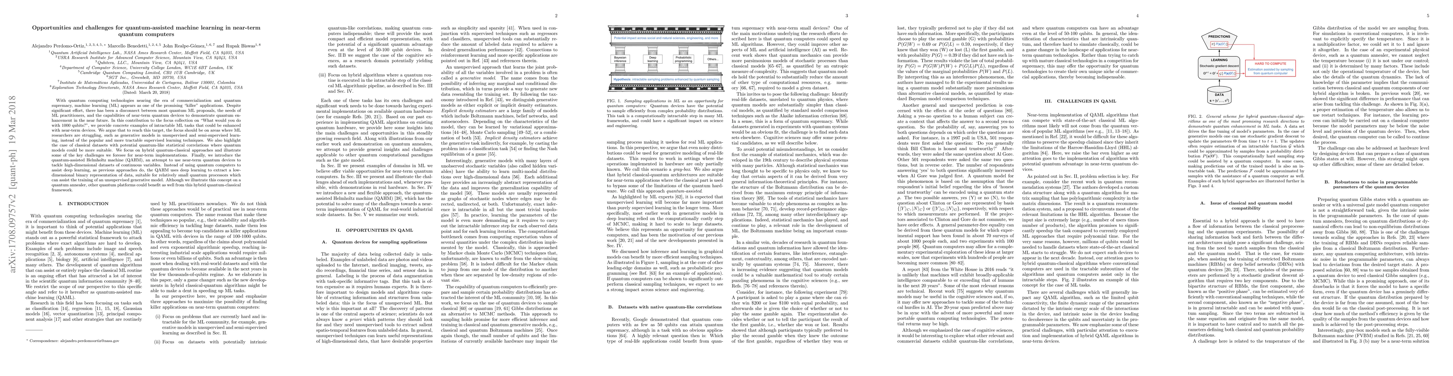 This paper explores the potential of quantum-assisted machine learning (ML) in near-term quantum computers, emphasizing the need for hybrid quantum-classical approaches to tackle intractable ML tasks. It introduces the quantum-assisted Helmholtz machine (QAHM) to leverage small quantum devices for unsupervised generative modeling, highlighting the challenges and opportunities in this emerging field.