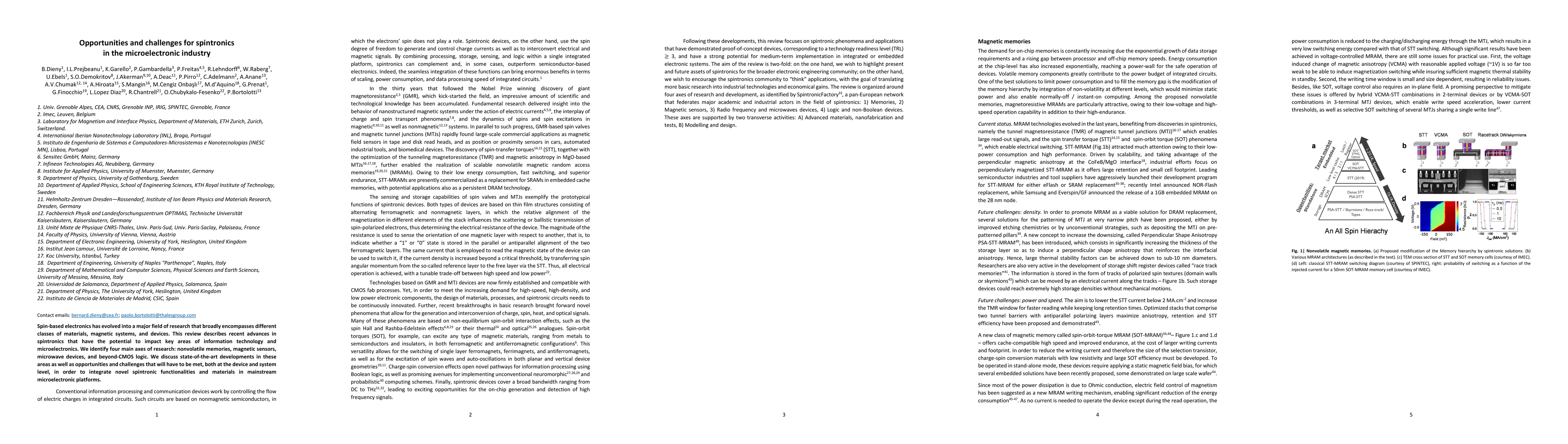 Spin-based electronics has evolved into a major field of research that broadly encompasses different classes of materials, magnetic systems, and devices. This review describes recent advances in spintronics that have the potential to impact key areas of information technology and microelectronics. We identify four main axes of research: nonvolatile memories, magnetic sensors, microwave devices, and beyond-CMOS logic. We discuss state-of-the-art developments in these areas as well as opportunities and challenges that will have to be met, both at the device and system level, in order to integrate novel spintronic functionalities and materials in mainstream microelectronic platforms.