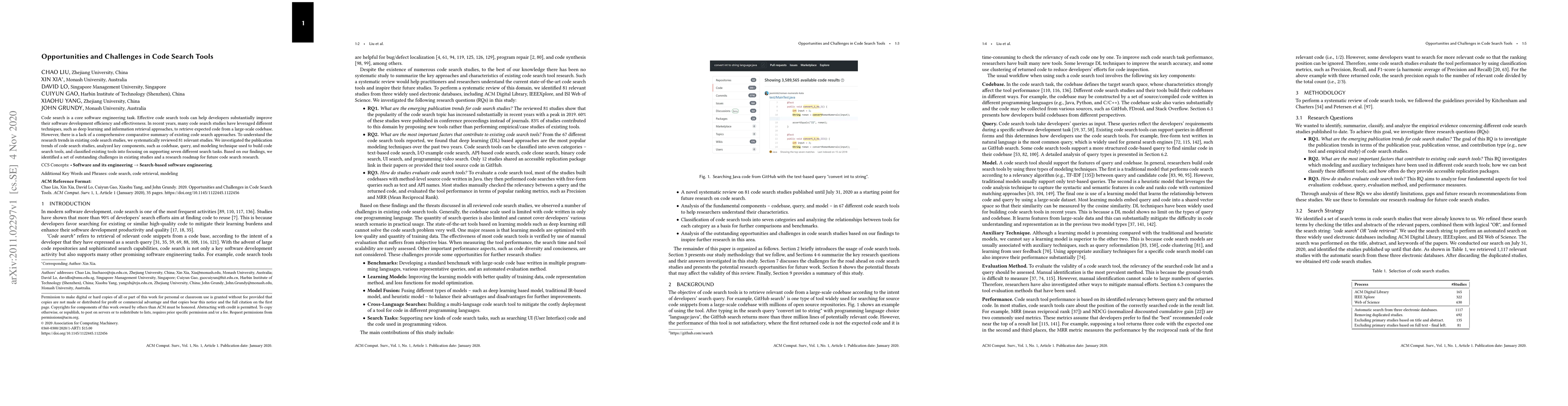 Code search is a core software engineering task. Effective code search tools can help developers substantially improve their software development efficiency and effectiveness. In recent years, many code search studies have leveraged different techniques, such as deep learning and information retrieval approaches, to retrieve expected code from a large-scale codebase. However, there is a lack of a comprehensive comparative summary of existing code search approaches. To understand the research trends in existing code search studies, we systematically reviewed 81 relevant studies. We investigated the publication trends of code search studies, analyzed key components, such as codebase, query, and modeling technique used to build code search tools, and classified existing tools into focusing on supporting seven different search tasks. Based on our findings, we identified a set of outstanding challenges in existing studies and a research roadmap for future code search research.