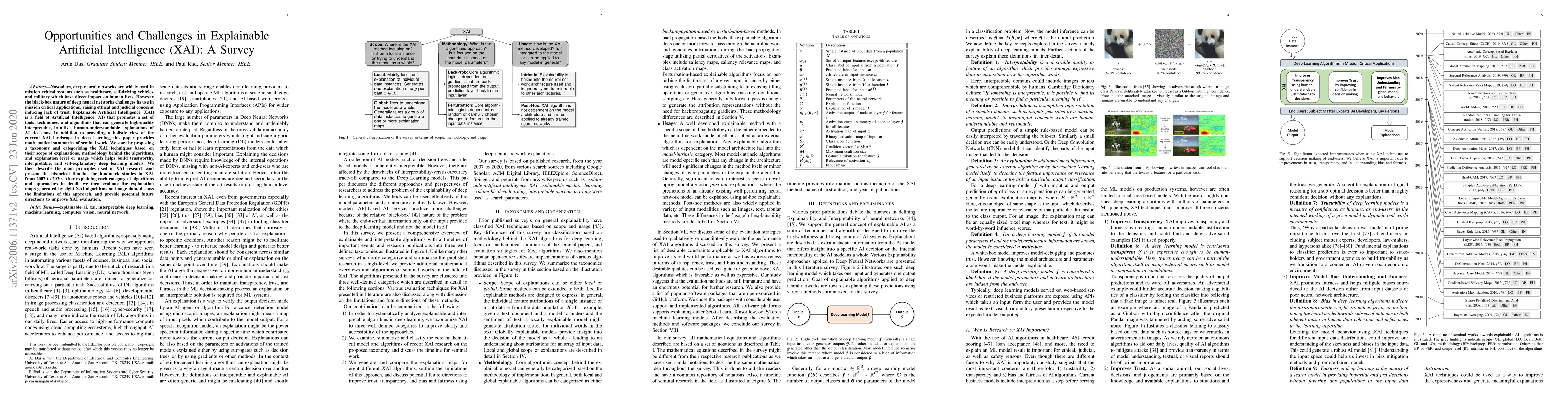 Nowadays, deep neural networks are widely used in mission critical systems such as healthcare, self-driving vehicles, and military which have direct impact on human lives. However, the black-box nature of deep neural networks challenges its use in mission critical applications, raising ethical and judicial concerns inducing lack of trust. Explainable Artificial Intelligence (XAI) is a field of Artificial Intelligence (AI) that promotes a set of tools, techniques, and algorithms that can generate high-quality interpretable, intuitive, human-understandable explanations of AI decisions. In addition to providing a holistic view of the current XAI landscape in deep learning, this paper provides mathematical summaries of seminal work. We start by proposing a taxonomy and categorizing the XAI techniques based on their scope of explanations, methodology behind the algorithms, and explanation level or usage which helps build trustworthy, interpretable, and self-explanatory deep learning models. We then describe the main principles used in XAI research and present the historical timeline for landmark studies in XAI from 2007 to 2020. After explaining each category of algorithms and approaches in detail, we then evaluate the explanation maps generated by eight XAI algorithms on image data, discuss the limitations of this approach, and provide potential future directions to improve XAI evaluation.