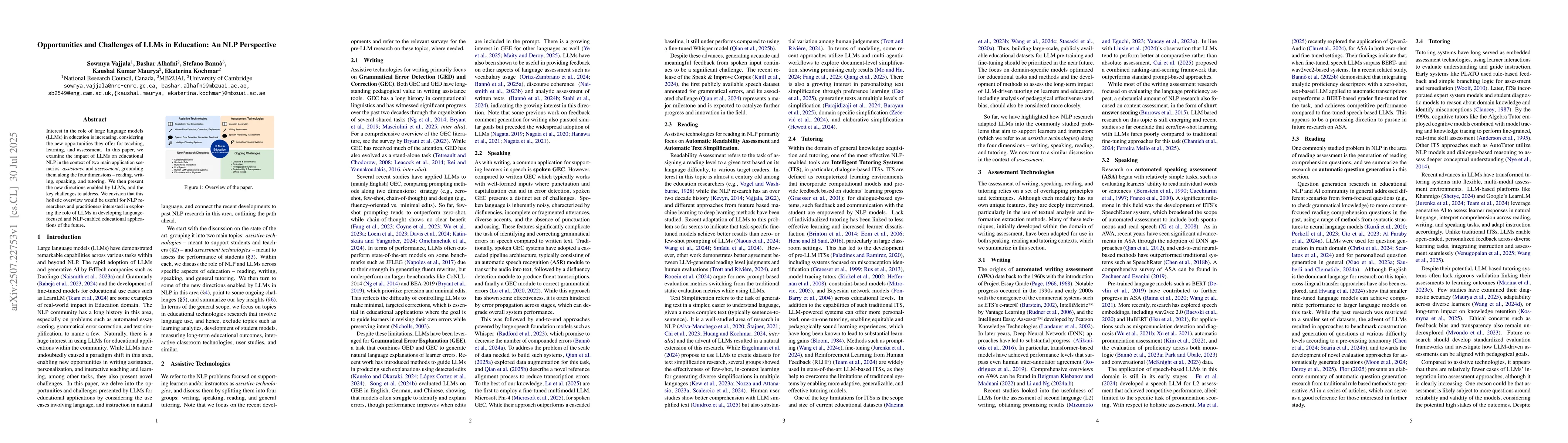 The paper provides a comprehensive overview of the opportunities and challenges of using large language models (LLMs) in education from an NLP perspective, examining their impact in assistance and assessment scenarios across reading, writing, speaking, and tutoring.