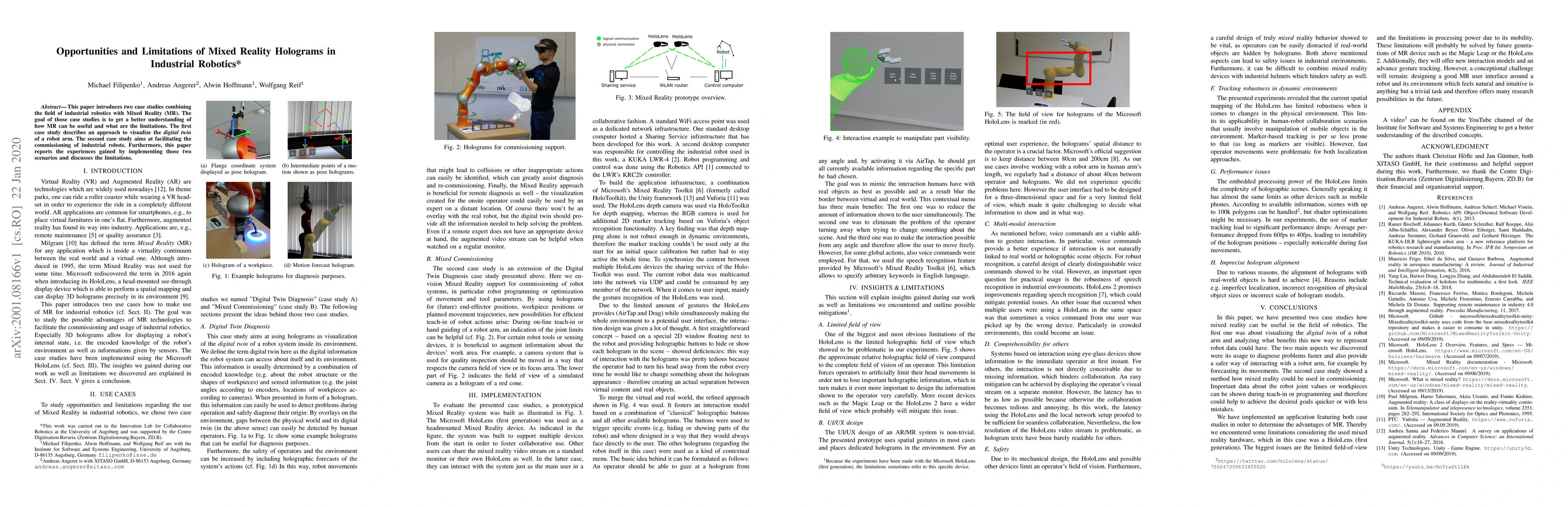 This paper explores the potential of Mixed Reality (MR) holograms in industrial robotics, highlighting their applications and limitations through two case studies.