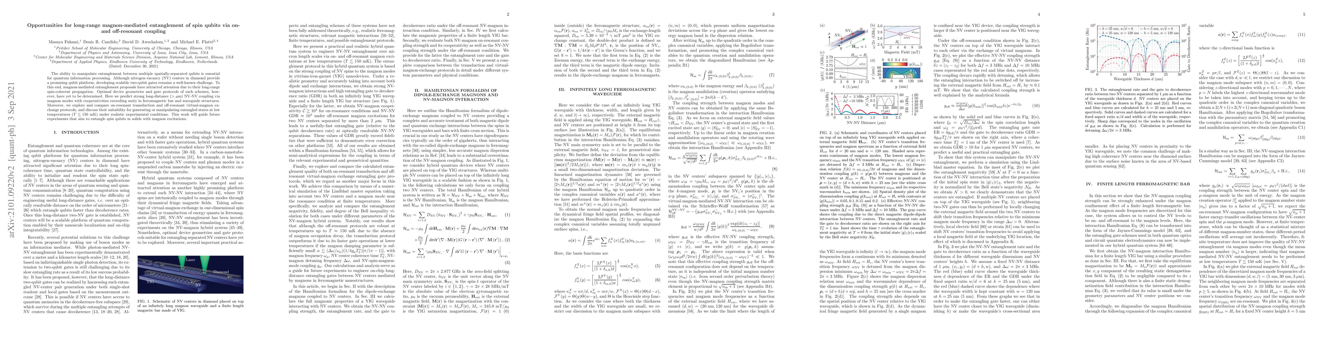 This paper proposes magnon-mediated entanglement between nitrogen-vacancy (NV) centers in diamond for scalable quantum information processing, predicting strong long-range coupling via ferromagnetic structures and comparing on-resonant and off-resonant protocols for generating entangled states at low temperatures.
