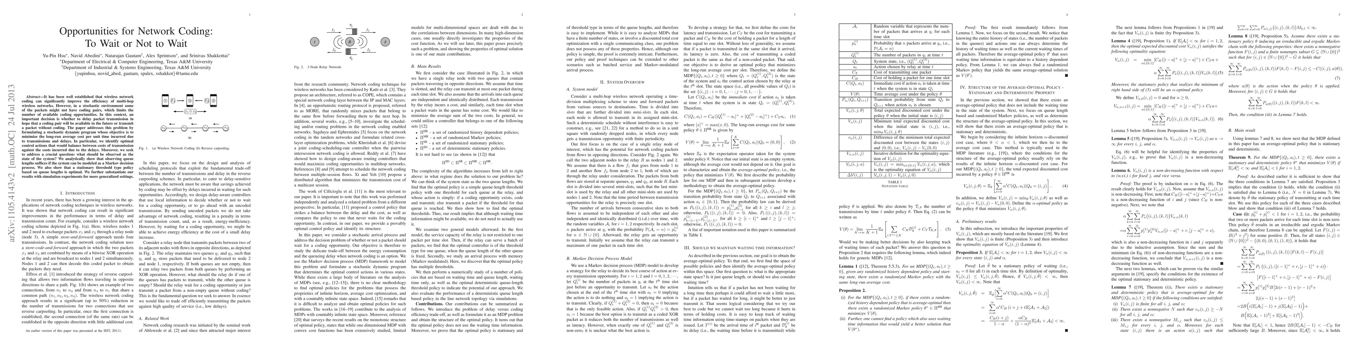 It has been well established that wireless network coding can significantly improve the efficiency of multi-hop wireless networks. However, in a stochastic environment some of the packets might not have coding pairs, which limits the number of available coding opportunities. In this context, an important decision is whether to delay packet transmission in hope that a coding pair will be available in the future or transmit a packet without coding. The paper addresses this problem by formulating a stochastic dynamic program whose objective is to minimize the long-run average cost per unit time incurred due to transmissions and delays. In particular, we identify optimal control actions that would balance between costs of transmission against the costs incurred due to the delays. Moreover, we seek to address a crucial question: what should be observed as the state of the system? We analytically show that observing queue lengths suffices if the system can be modeled as a Markov decision process. We also show that a stationary threshold type policy based on queue lengths is optimal. We further substantiate our results with simulation experiments for more generalized settings.