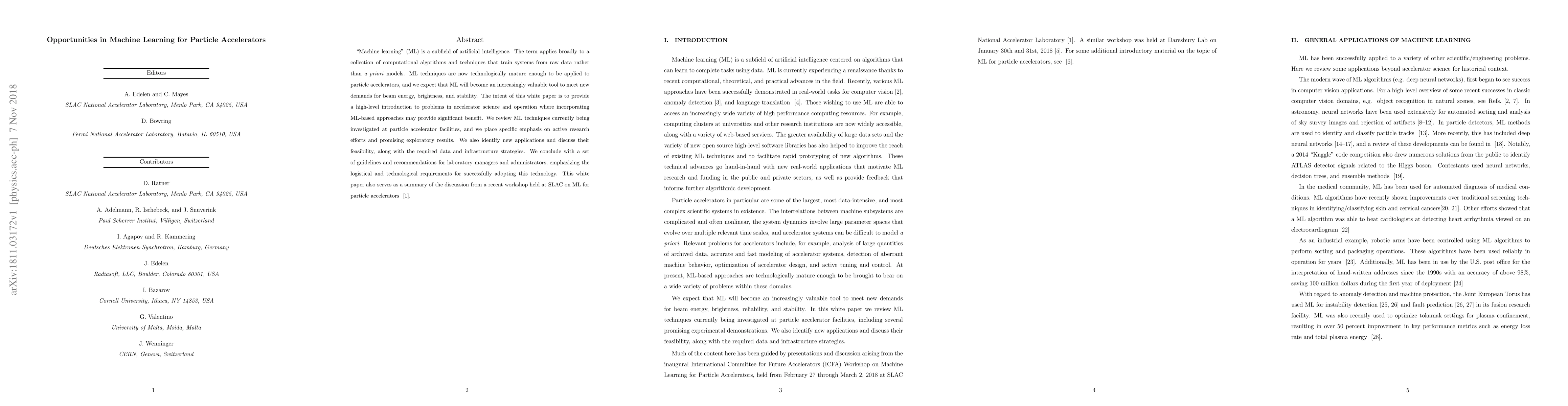 Machine learning (ML) is a subfield of artificial intelligence. The term applies broadly to a collection of computational algorithms and techniques that train systems from raw data rather than a priori models. ML techniques are now technologically mature enough to be applied to particle accelerators, and we expect that ML will become an increasingly valuable tool to meet new demands for beam energy, brightness, and stability. The intent of this white paper is to provide a high-level introduction to problems in accelerator science and operation where incorporating ML-based approaches may provide significant benefit. We review ML techniques currently being investigated at particle accelerator facilities, and we place specific emphasis on active research efforts and promising exploratory results. We also identify new applications and discuss their feasibility, along with the required data and infrastructure strategies. We conclude with a set of guidelines and recommendations for laboratory managers and administrators, emphasizing the logistical and technological requirements for successfully adopting this technology. This white paper also serves as a summary of the discussion from a recent workshop held at SLAC on ML for particle accelerators.