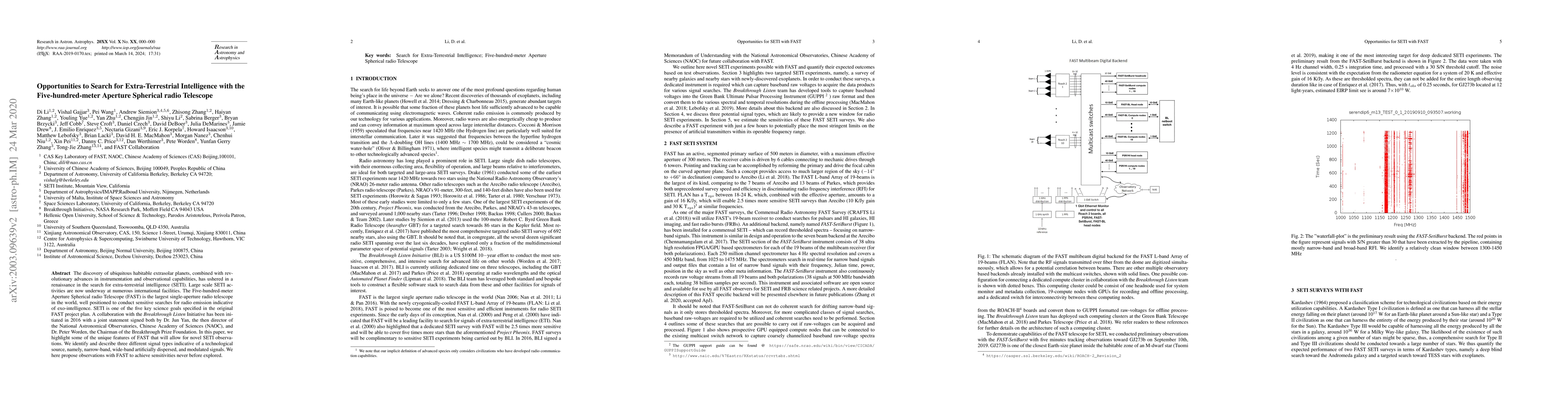 The Five-hundred-meter Aperture Spherical radio Telescope (FAST) is equipped to search for extra-terrestrial intelligence with unprecedented sensitivity, focusing on novel signal types that could indicate technological sources.