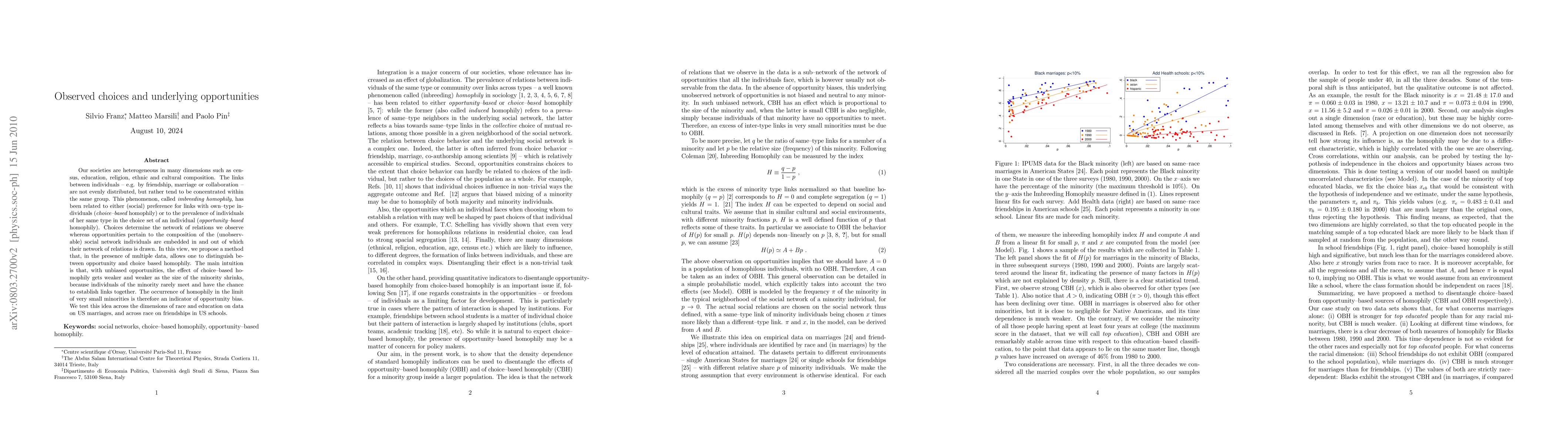 Our societies are heterogeneous in many dimensions such as census, education, religion, ethnic and cultural composition. The links between individuals - e.g. by friendship, marriage or collaboration - are not evenly distributed, but rather tend to be concentrated within the same group. This phenomenon, called `imbreeding homophily', has been related to either (social) preference for links with own-type individuals (`choice-based' homophily) or to the prevalence of individuals of her same type in the choice set of an individual (`opportunity-based' homophily). Choices determine the network of relations we observe whereas opportunities pertain to the composition of the (unobservable) social network individuals are embedded in and out of which their network of relations is drawn. In this view, we propose a method that, in the presence of multiple data, allows one to distinguish between opportunity and choice based homophily. The main intuition is that, with unbiased opportunities, the effect of choice-based homophily gets weaker and weaker as the size of the minority shrinks, because individuals of the minority rarely meet and have the chance to establish links together. The occurrence of homophily in the limit of very small minorities is therefore an indicator of opportunity bias. We test this idea across the dimensions of race and education on data on US marriages, and across race on friendships in US schools.
