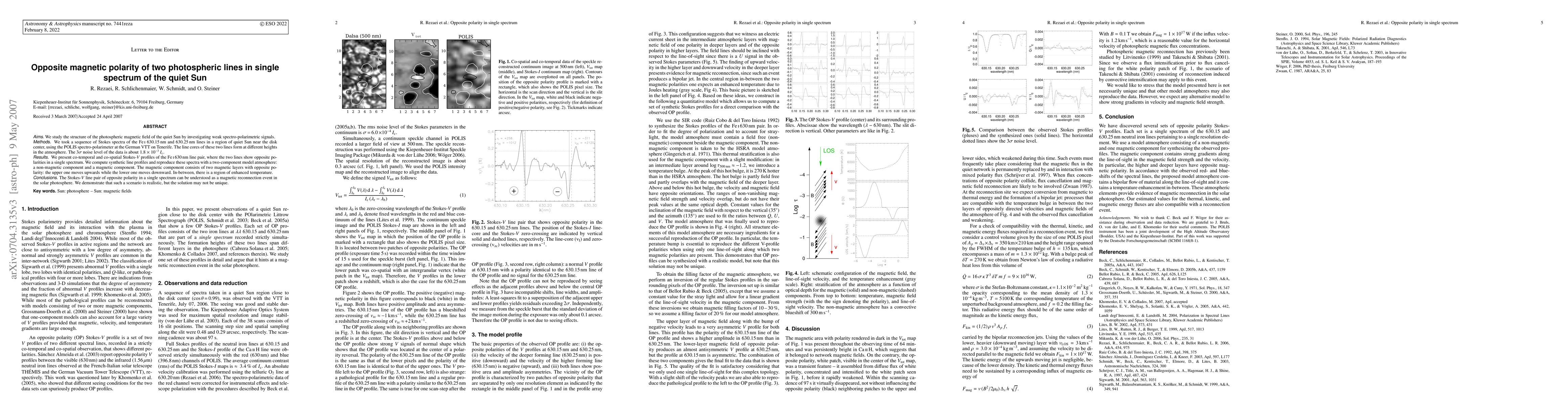 This study investigates the magnetic field structure in the quiet Sun using spectro-polarimetry of Fe I lines, revealing opposite polarities in a single spectrum. The findings suggest a magnetic reconnection event, with a two-component model atmosphere showing upward and downward magnetic layers.