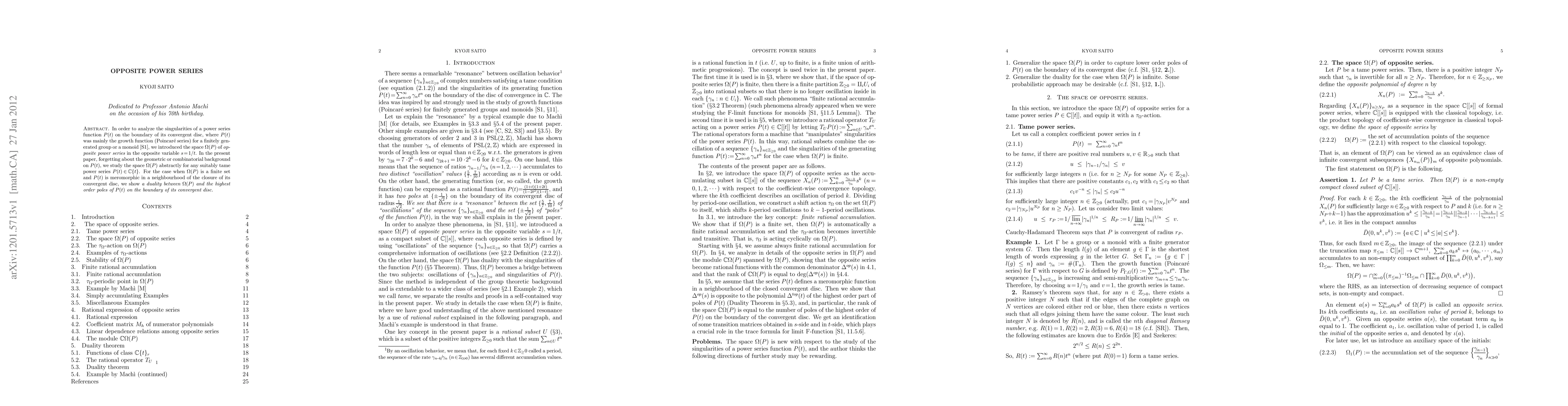 Let $\gamma_n$ ($n\in \mathbb{Z}_{\ge0}$) be a sequence of complex numbers, which is tame: $0<\exists u\le \gamma_{n-1}/\gamma_n \le \exists v<\infty$ for all $n>0$. We show a resonance between the singularities of the function of the power series $P(t):=\sum_{n=0}^\infty \gamma_n t^n$ on its boundary of the disc of convergence and the oscillation behavior of the sequences $\gamma_{n-k}/\gamma_n$ ($n\in \mathbb{Z}_{>>0}$) for $k>0$. The resonance is proven by introducing the space of opposite power series, which is the compact subspace of the space of all formal power series in the opposite variable $s=1/t$ and is defined as the accumulating set of the sequence $X_n(s):=\sum_{k=0}^n\frac{\gamma_{n-k}}{\gamma_n}t^k$ ($n\in \mathbb{Z}_{\ge0}$). We analyze in details an example of the growth series $P(t)$ for the modular group $PSL(2,Z)$ due to Machi.
