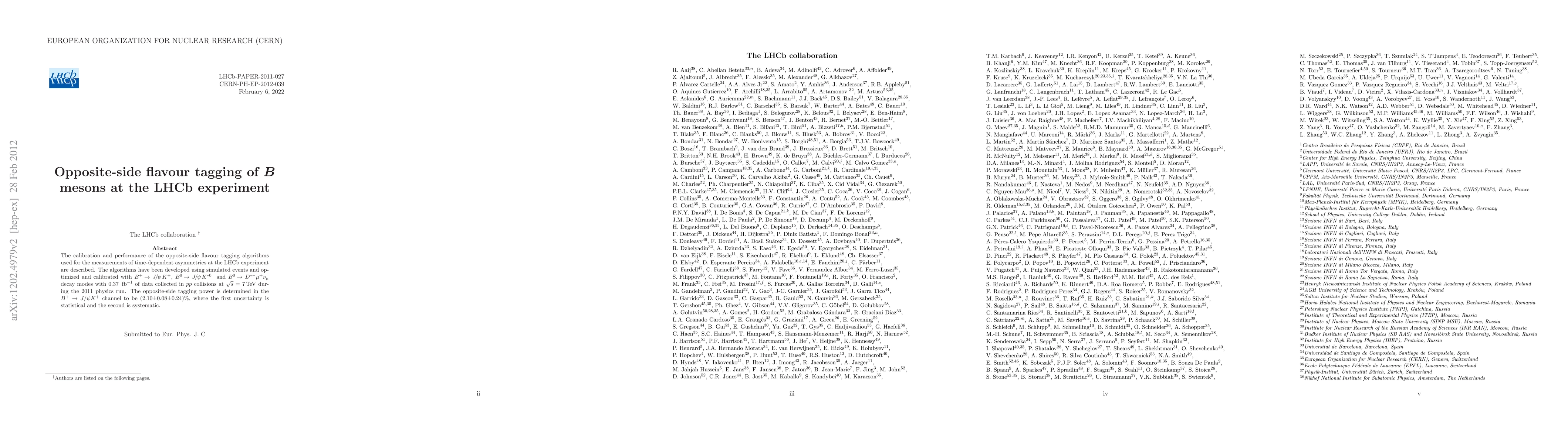 This paper details the calibration and performance of opposite-side flavour tagging algorithms at the LHCb experiment, which are crucial for measuring time-dependent asymmetries. The algorithms were optimized using simulated events and calibrated with data from specific decay modes, achieving a tagging power of 2.10% in the B+ -> J/psi K+ channel.