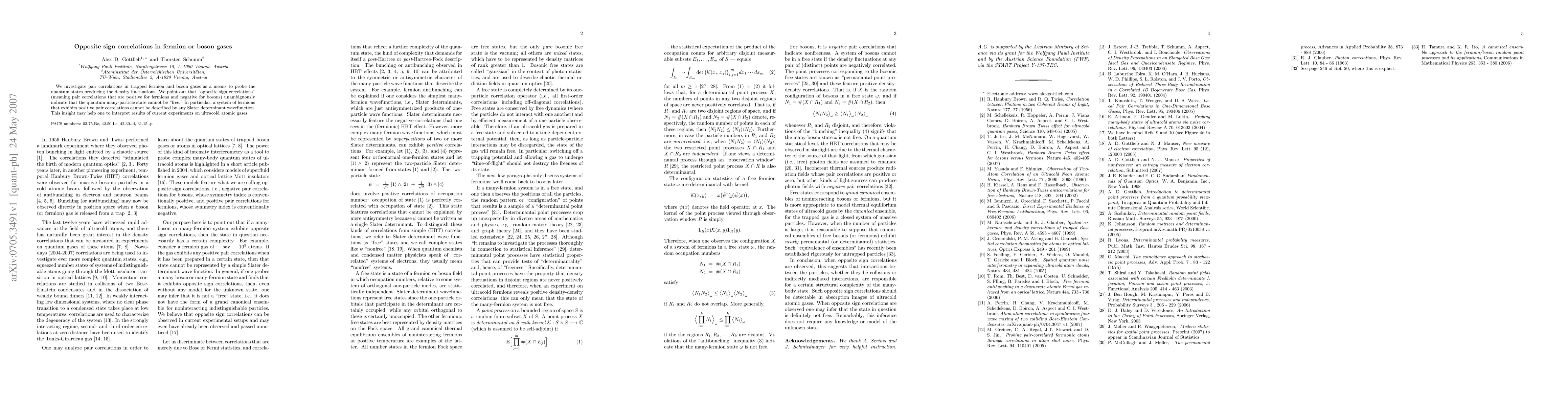 We investigate pair correlations in trapped fermion and boson gases as a means to probe the quantum states producing the density fluctuations. We point out that "opposite sign correlations" (meaning pair correlations that are positive for fermions and negative for bosons) unambiguously indicate that the quantum many-particle state cannot be "free." In particular, a system of fermions that exhibits positive pair correlations cannot be described by any Slater determinant wavefunction. This insight may help one to interpret results of current experiments on ultracold atomic gases.