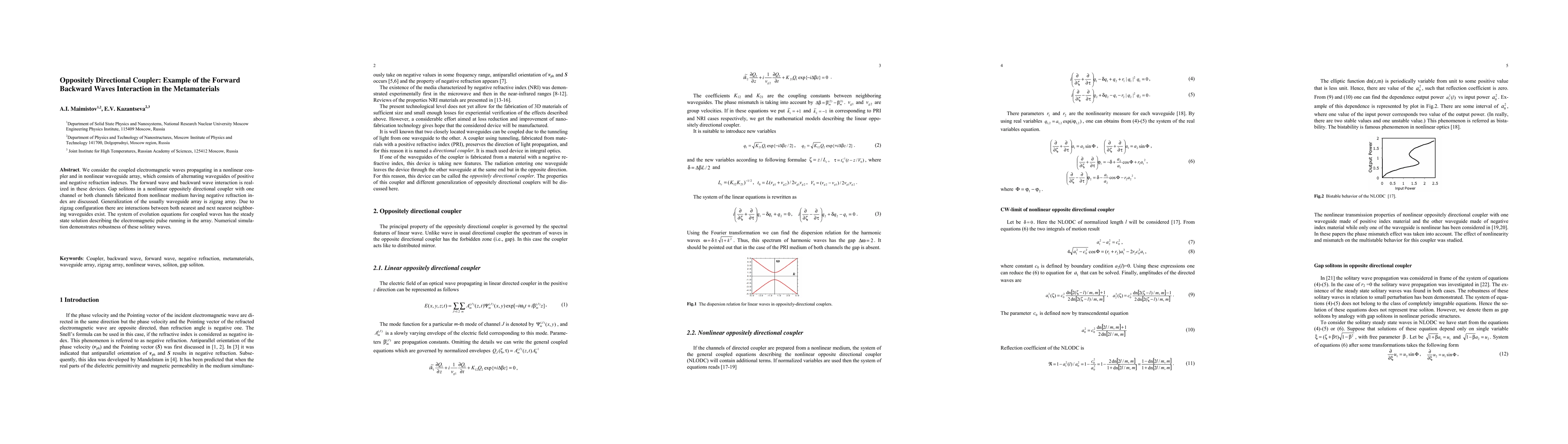 This paper explores the interaction between forward and backward waves in a nonlinear zigzag array of waveguides with alternating positive and negative refraction indexes, focusing on the formation of gap solitons in oppositely directional couplers. Numerical simulations reveal the robustness of these electromagnetic solitons in the nonlinear medium.