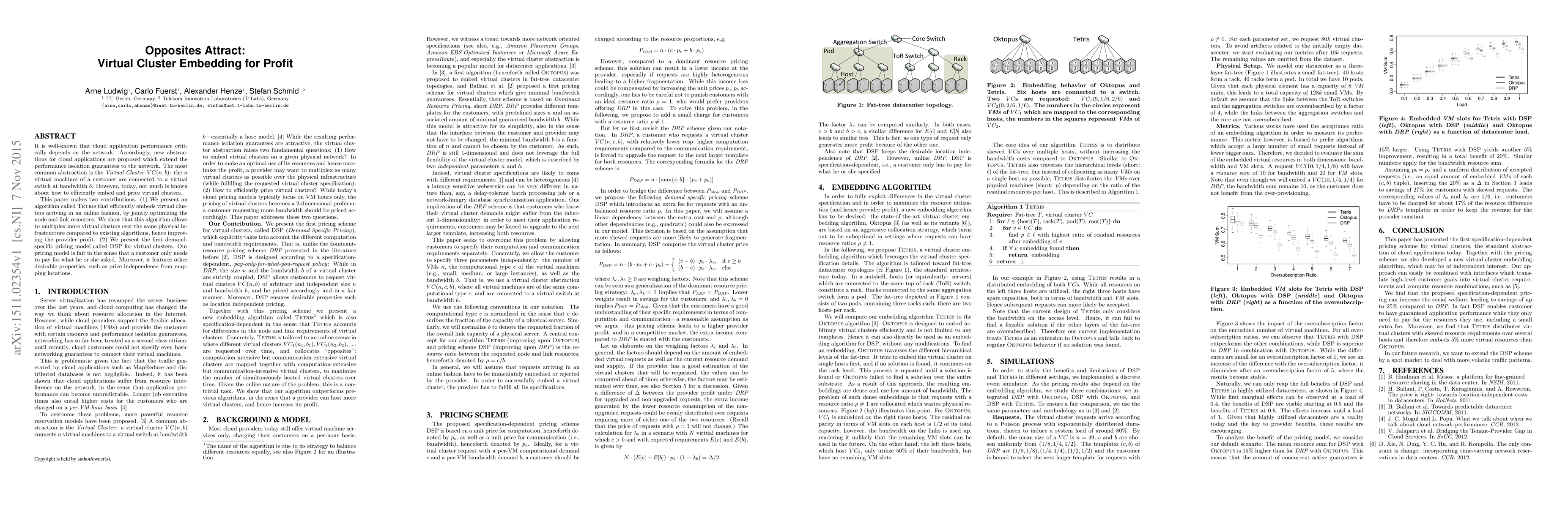 A new algorithm called Tetris efficiently embeds virtual clusters in cloud networks, allowing for more multiplexing of virtual machines over physical infrastructure and improved provider profit. The paper also introduces a demand-specific pricing model, DSP, which is fair and price-independent from mapping locations.