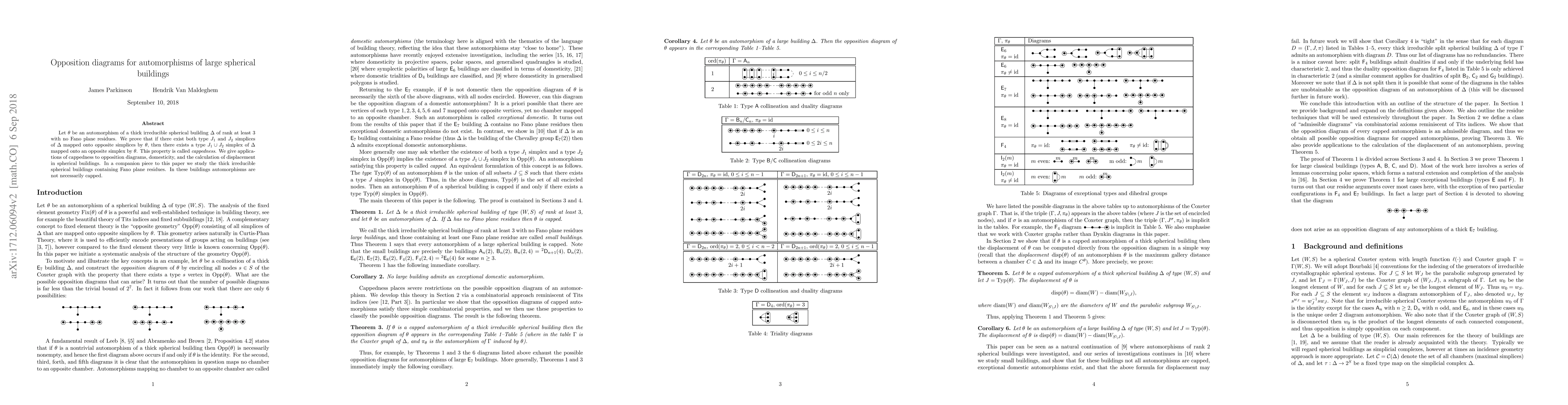 This paper proves that certain automorphisms of thick irreducible spherical buildings, which lack Fano plane residues, exhibit a property called "cappedness" if they map type $J_1$ and $J_2$ simplices to opposite simplices. The authors apply this property to opposition diagrams, domesticity, and displacement calculations.