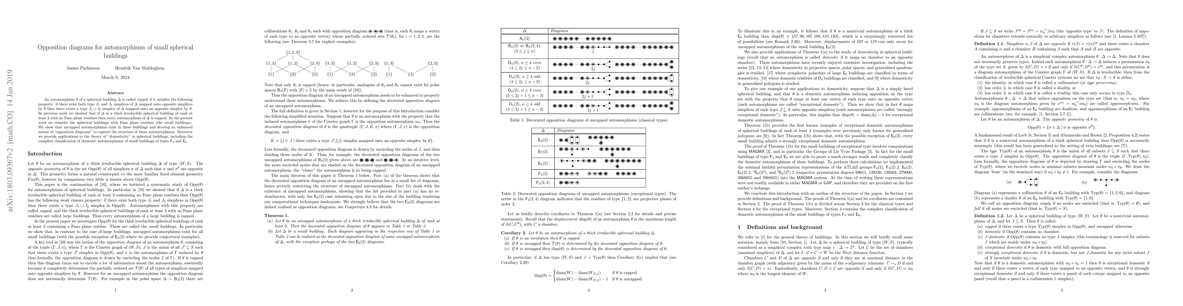 An automorphism $\theta$ of a spherical building $\Delta$ is called \textit{capped} if it satisfies the following property: if there exist both type $J_1$ and $J_2$ simplices of $\Delta$ mapped onto opposite simplices by $\theta$ then there exists a type $J_1\cup J_2$ simplex of $\Delta$ mapped onto an opposite simplex by $\theta$. In previous work we showed that if $\Delta$ is a thick irreducible spherical building of rank at least $3$ with no Fano plane residues then every automorphism of $\Delta$ is capped. In the present work we consider the spherical buildings with Fano plane residues (the \textit{small buildings}). We show that uncapped automorphisms exist in these buildings and develop an enhanced notion of "opposition diagrams" to capture the structure of these automorphisms. Moreover we provide applications to the theory of "domesticity" in spherical buildings, including the complete classification of domestic automorphisms of small buildings of types $\mathsf{F}_4$ and $\mathsf{E}_6$.