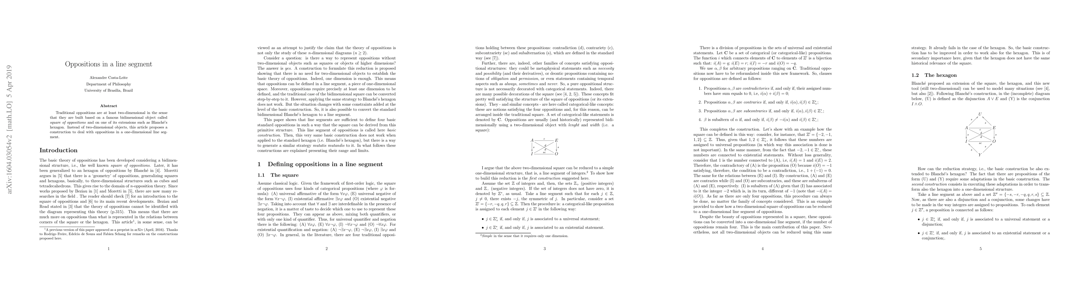 Traditional oppositions are at least two-dimensional in the sense that they are built based on a famous bidimensional object called square of oppositions and on one of its extensions such as Blanch\'e's hexagon. Instead of two-dimensional objects, this article proposes a construction to deal with oppositions in a one-dimensional line segment.