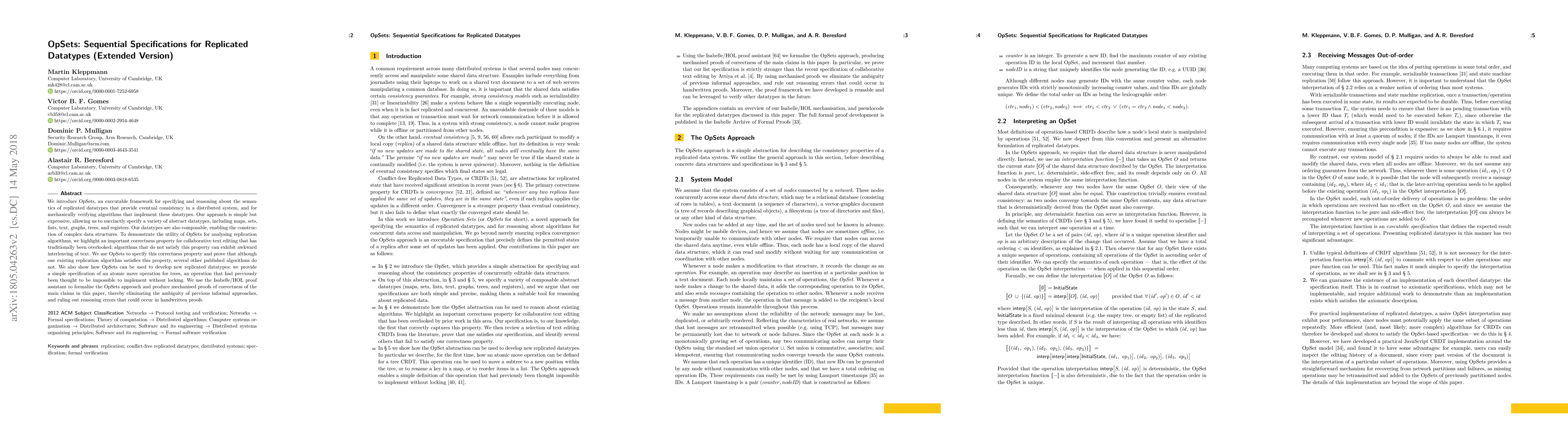OpSets is an executable framework for specifying and verifying the semantics of replicated datatypes with eventual consistency in distributed systems, using the Isabelle/HOL proof assistant to produce mechanised proofs of correctness. It enables the specification of complex data structures and demonstrates its utility by identifying a crucial correctness property in collaborative text editing, proving that some existing algorithms fail to satisfy it.