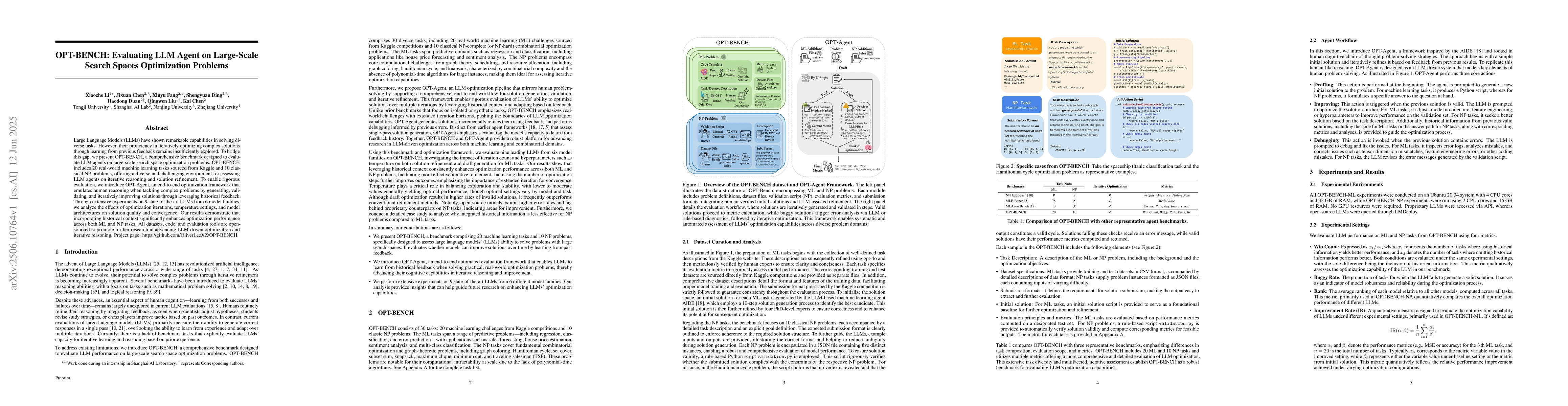 Large Language Models (LLMs) have shown remarkable capabilities in solving diverse tasks. However, their proficiency in iteratively optimizing complex solutions through learning from previous feedback remains insufficiently explored. To bridge this gap, we present OPT-BENCH, a comprehensive benchmark designed to evaluate LLM agents on large-scale search space optimization problems. OPT-BENCH includes 20 real-world machine learning tasks sourced from Kaggle and 10 classical NP problems, offering a diverse and challenging environment for assessing LLM agents on iterative reasoning and solution refinement. To enable rigorous evaluation, we introduce OPT-Agent, an end-to-end optimization framework that emulates human reasoning when tackling complex problems by generating, validating, and iteratively improving solutions through leveraging historical feedback. Through extensive experiments on 9 state-of-the-art LLMs from 6 model families, we analyze the effects of optimization iterations, temperature settings, and model architectures on solution quality and convergence. Our results demonstrate that incorporating historical context significantly enhances optimization performance across both ML and NP tasks. All datasets, code, and evaluation tools are open-sourced to promote further research in advancing LLM-driven optimization and iterative reasoning. Project page: \href{https://github.com/OliverLeeXZ/OPT-BENCH}{https://github.com/OliverLeeXZ/OPT-BENCH}.