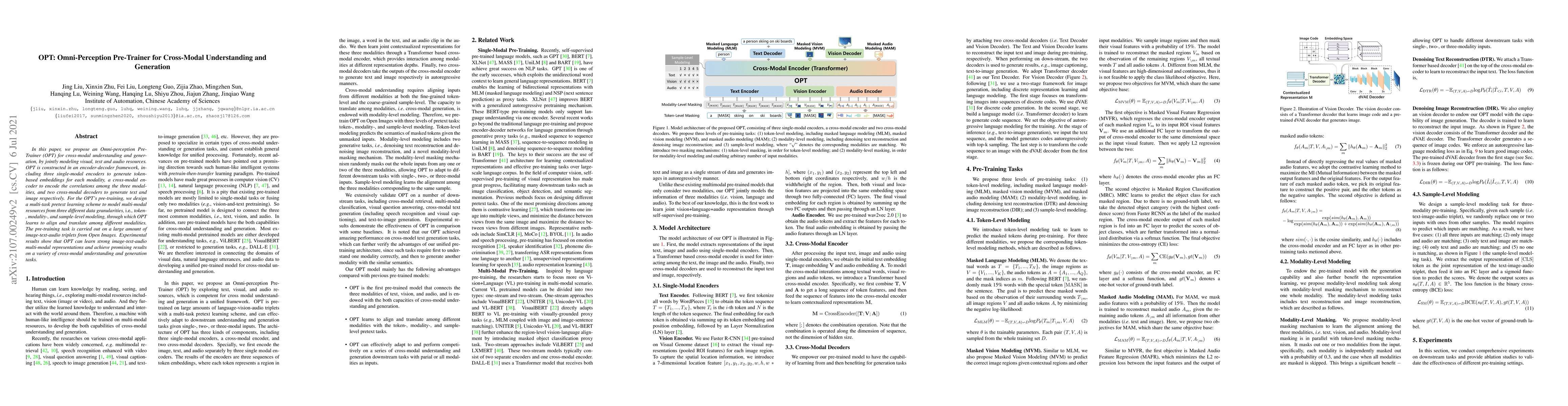 The paper introduces OPT, an Omni-perception Pre-Trainer for cross-modal understanding and generation, which jointly models visual, text, and audio data. OPT achieves this through an encoder-decoder framework and a multi-task pretext learning scheme, pre-trained on large image-text-audio triplets, demonstrating strong cross-modal representation learning and performance.