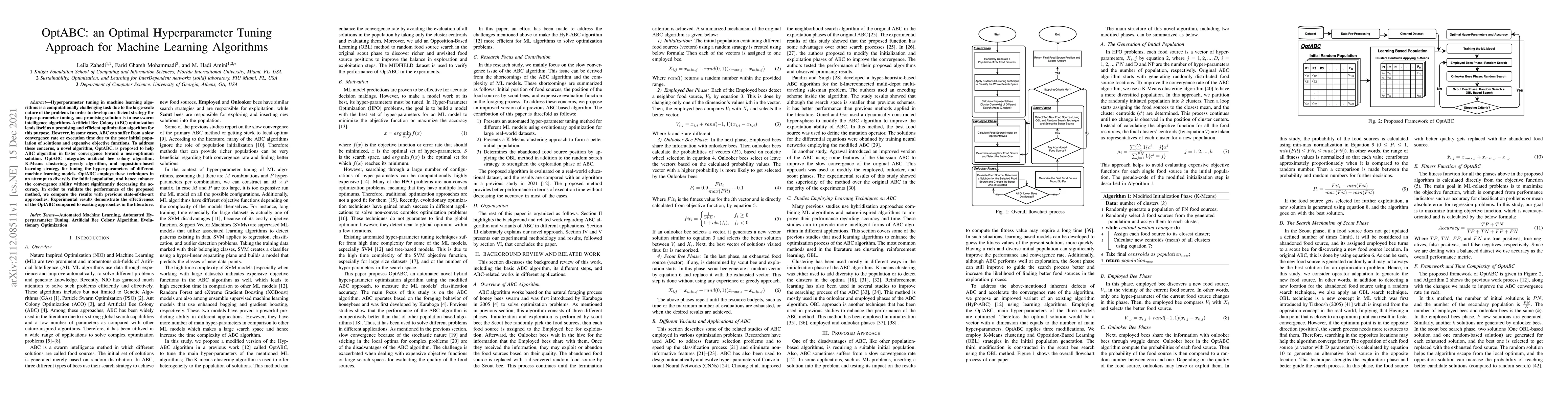 OptABC proposes an enhanced artificial bee colony optimization method for hyperparameter tuning in machine learning, integrating K-Means, greedy algorithm, and opposition-based learning to improve convergence speed and accuracy. Experimental results show OptABC outperforms existing state-of-the-art methods.