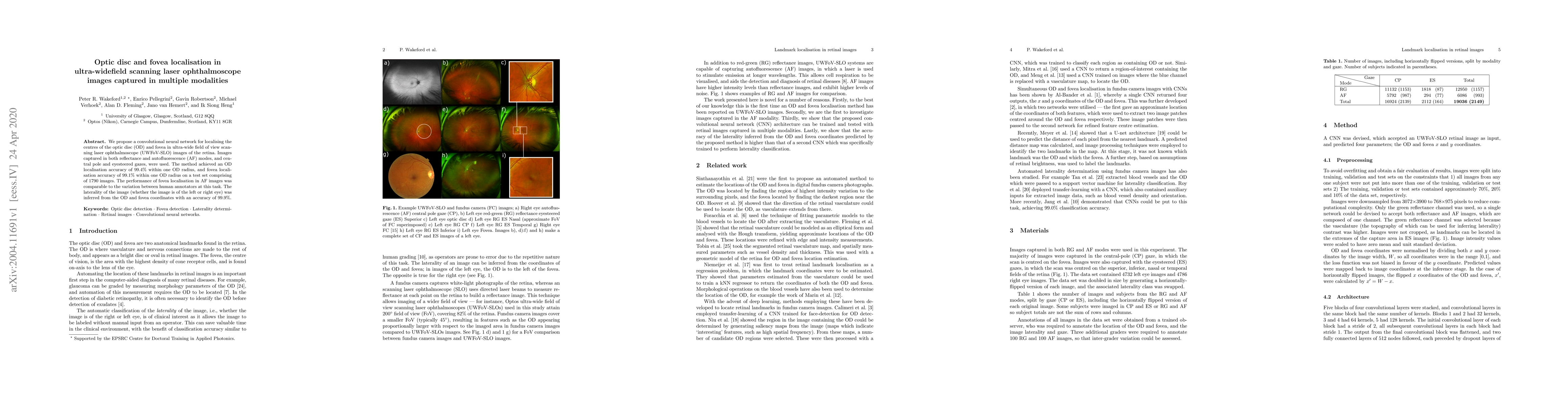 This paper presents a convolutional neural network for accurately localising the optic disc and fovea in ultra-widefield scanning laser ophthalmoscope images, achieving 99.4% and 99.1% accuracy respectively. The method was tested on images from various modalities and gazes, demonstrating high performance comparable to human annotators.