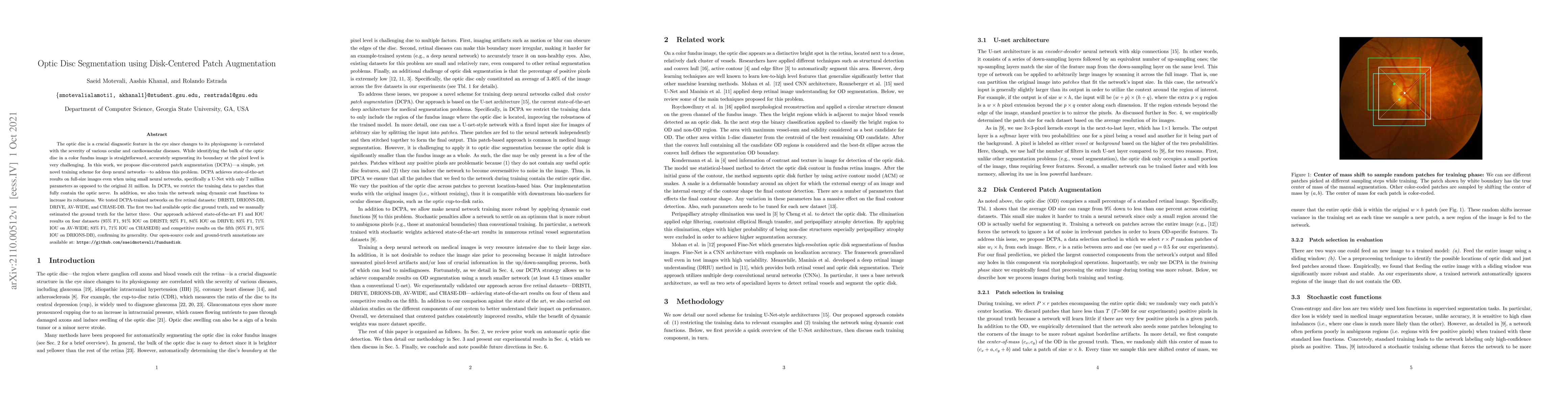The optic disc is a crucial diagnostic feature in the eye since changes to its physiognomy is correlated with the severity of various ocular and cardiovascular diseases. While identifying the bulk of the optic disc in a color fundus image is straightforward, accurately segmenting its boundary at the pixel level is very challenging. In this work, we propose disc-centered patch augmentation (DCPA) -- a simple, yet novel training scheme for deep neural networks -- to address this problem. DCPA achieves state-of-the-art results on full-size images even when using small neural networks, specifically a U-Net with only 7 million parameters as opposed to the original 31 million. In DCPA, we restrict the training data to patches that fully contain the optic nerve. In addition, we also train the network using dynamic cost functions to increase its robustness. We tested DCPA-trained networks on five retinal datasets: DRISTI, DRIONS-DB, DRIVE, AV-WIDE, and CHASE-DB. The first two had available optic disc ground truth, and we manually estimated the ground truth for the latter three. Our approach achieved state-of-the-art F1 and IOU results on four datasets (95 % F1, 91 % IOU on DRISTI; 92 % F1, 84 % IOU on DRIVE; 83 % F1, 71 % IOU on AV-WIDE; 83 % F1, 71 % IOU on CHASEDB) and competitive results on the fifth (95 % F1, 91 % IOU on DRIONS-DB), confirming its generality. Our open-source code and ground-truth annotations are available at: https://github.com/saeidmotevali/fundusdisk
