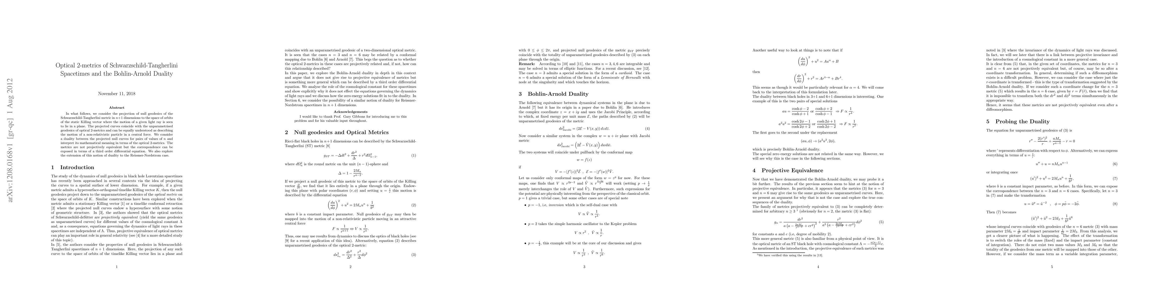 We consider the projection of null geodesics of the Schwarzschild-Tangherlini metric in n+1 dimensions to the space of orbits of the static Killing vector where the motion of a given light ray is seen to lie in a plane. The projected curves coincide with the unparametrised geodesics of optical 2-metrics and can be equally understood as describing the motion of a non-relativistic particle in a central force. We consider a duality between the projected null curves for pairs of values of n and interpret its mathematical meaning in terms of the optical 2-metrics. The metrics are not projectively equivalent but the correspondence can be exposed in terms of a third order differential equation. We also explore the extension of this notion of duality to the Reissner-Nordstrom case.