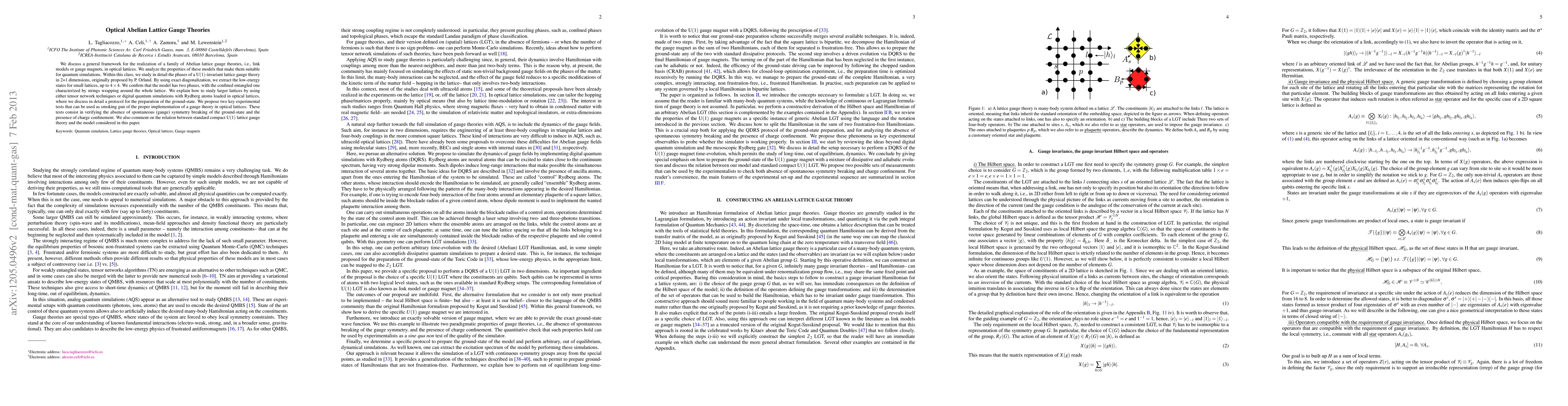 This paper presents a framework for simulating abelian lattice gauge theories in optical lattices, focusing on a U(1)-invariant model in 2+1 dimensions. The study confirms the existence of two phases, including a confined entangled phase with string-like excitations, and proposes methods for simulating larger systems using tensor networks or digital quantum simulations with Rydberg atoms.
