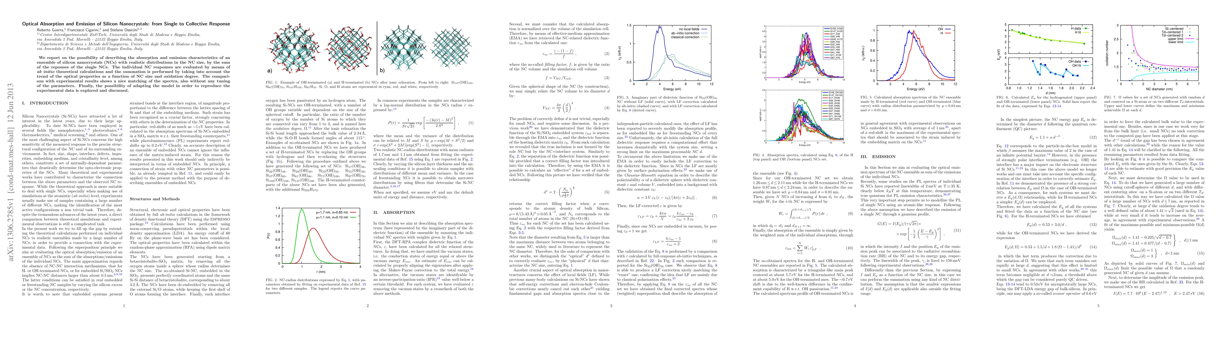 This paper explores the optical absorption and emission characteristics of silicon nanocrystals using ab-initio calculations to model individual nanocrystals, then sums these responses to describe an ensemble. The model accurately matches experimental spectra without parameter tuning, demonstrating its potential for adapting to experimental data.