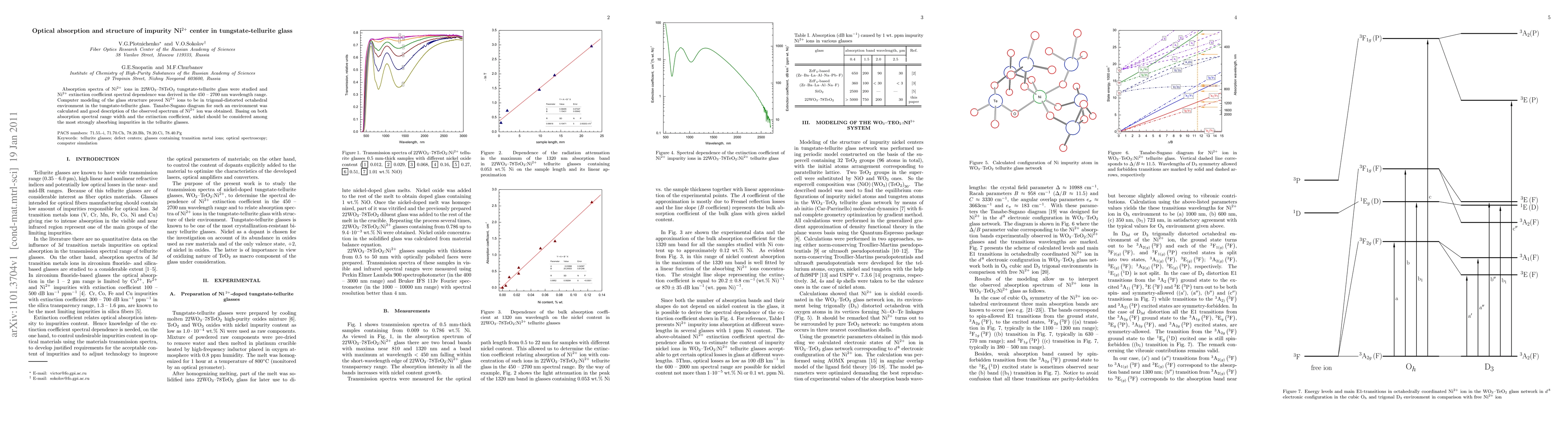 Absorption spectra of Ni$^{2+}$ ions in 22WO$_3$--78TeO$_2$ tungstate-tellurite glass were studied and Ni$^{2+}$ extinction coefficient spectral dependence was derived in the 450 -- 2700 nm wavelength range. Computer modeling of the glass structure proved Ni$^{2+}$ ions to be in trigonal-distorted octahedral environment in the tungstate-tellurite glass. Tanabe-Sugano diagram for such an environment was calculated and good description of the observed spectrum of Ni$^{2+}$ ion was obtained. Basing on both absorption spectral range width and the extinction coefficient, nickel should be considered among the most strongly absorbing impurities in the tellurite glasses.