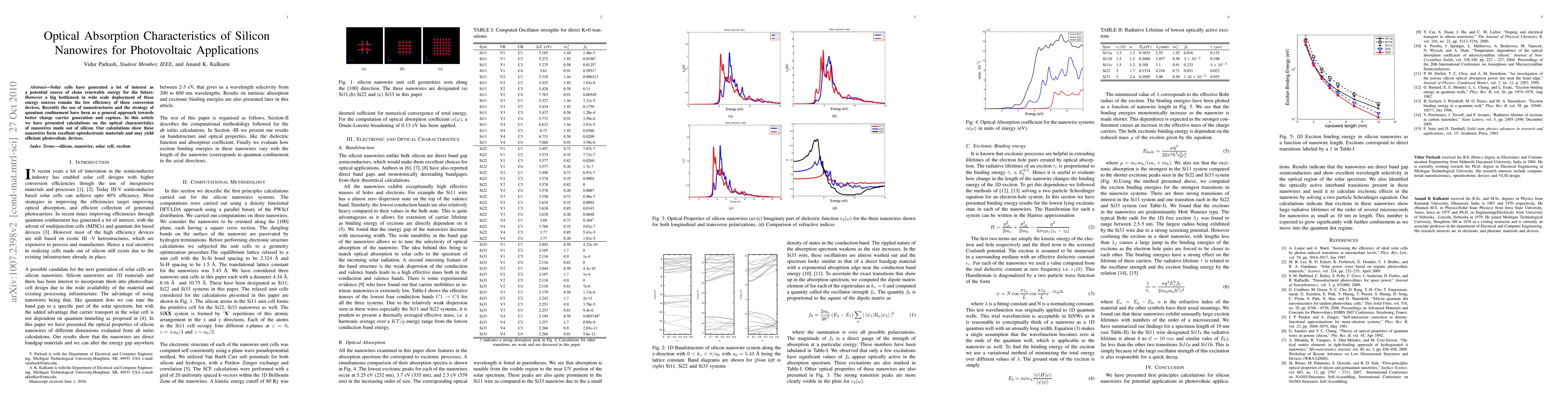 This paper investigates the optical absorption characteristics of silicon nanowires, demonstrating their potential as efficient optoelectronic materials for photovoltaic applications, which could help overcome the efficiency limitations of current solar cells.