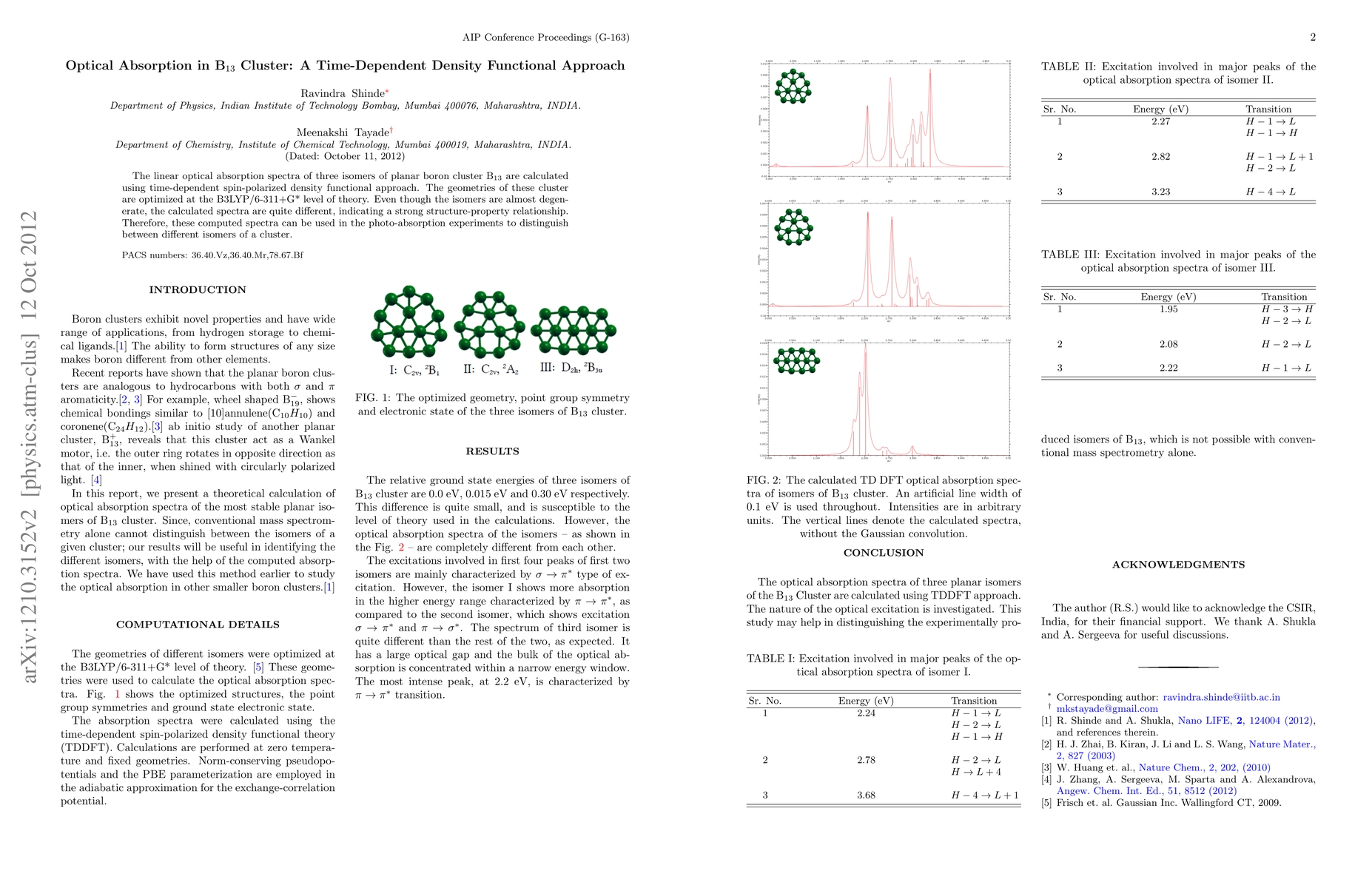 This study calculates the optical absorption spectra of three isomers of planar boron cluster B$_{13}$ using a time-dependent density functional approach. Despite the isomers' near-degeneracy, the distinct calculated spectra suggest a strong structure-property relationship, enabling potential differentiation in photo-absorption experiments.