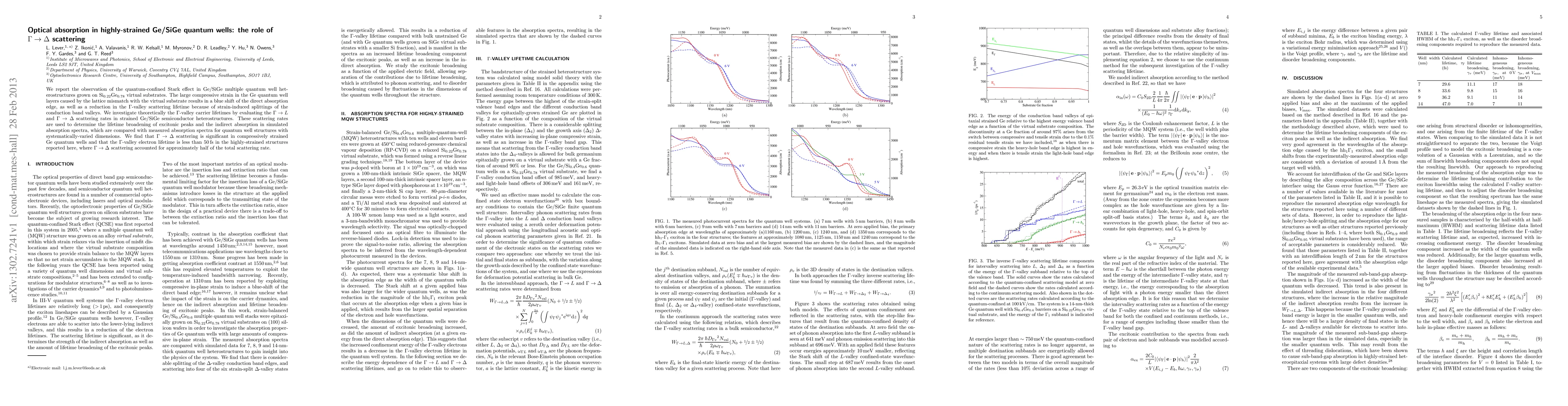 This paper reports the quantum-confined Stark effect in Ge/SiGe quantum wells, revealing a blue shift in absorption due to compressive strain and significant \Gamma-to-\Delta{} scattering, which reduces the \Gamma-valley electron lifetime to less than 50 fs. Theoretical evaluation of scattering rates matches simulated absorption spectra with experimental data.