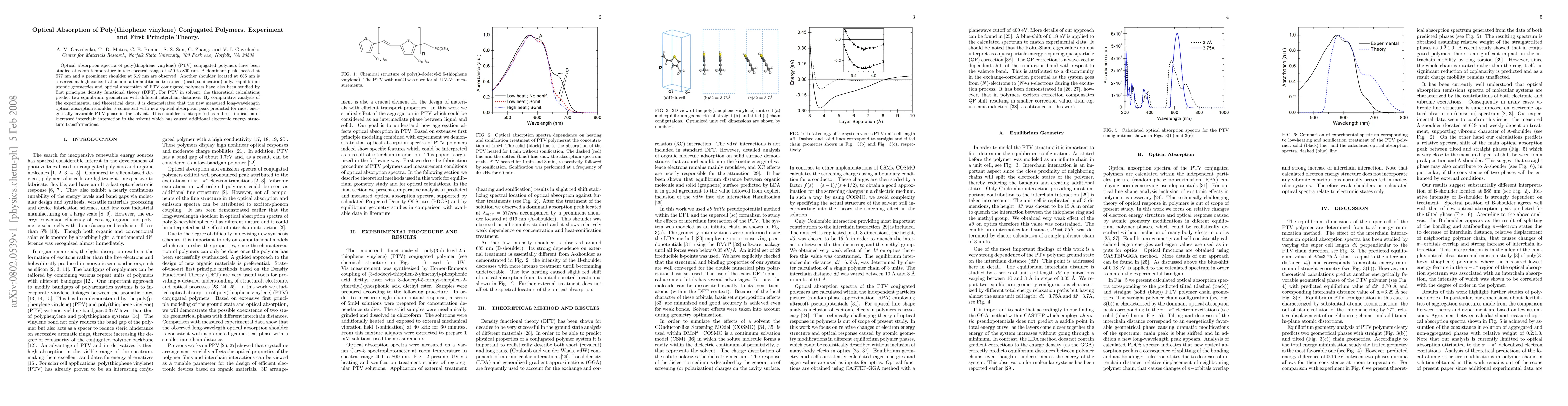 This paper investigates the optical absorption spectra of poly(thiophene vinylene) (PTV) conjugated polymers, identifying a dominant peak at 577 nm and additional shoulders at 619 nm and 685 nm under specific conditions. Theoretical DFT calculations support these findings, revealing two equilibrium geometries and predicting the long-wavelength shoulder as evidence of increased interchain interactions in the solvent.