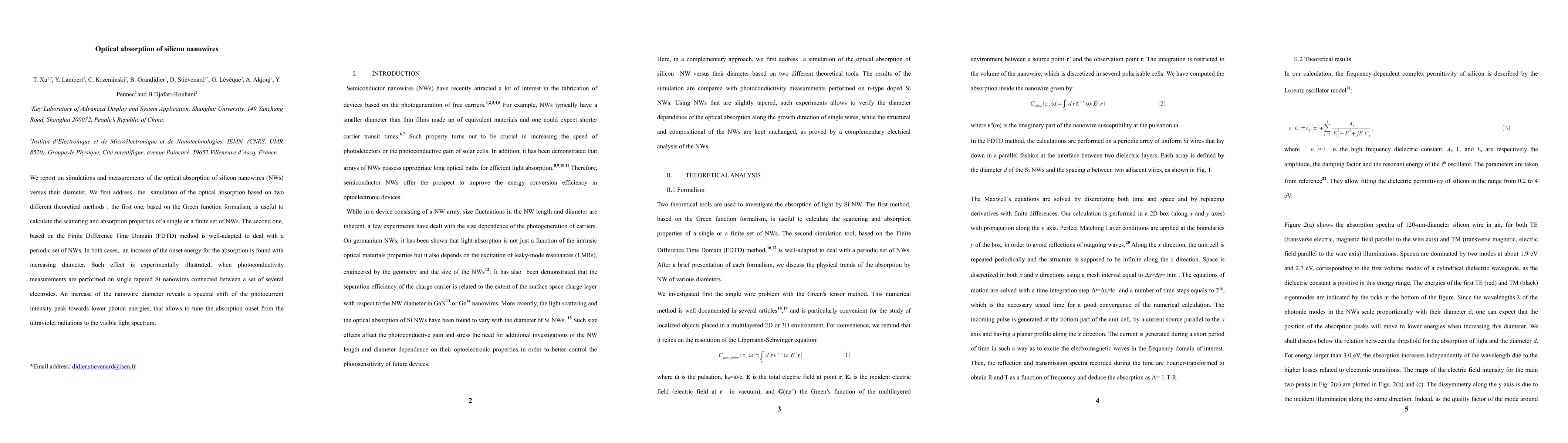 This paper investigates the optical absorption properties of silicon nanowires (NWs) using simulations and measurements, revealing that larger diameters shift the absorption onset from ultraviolet to visible light. Theoretical methods, including Green function formalism and FDTD, and experimental photoconductivity measurements confirm this spectral shift.