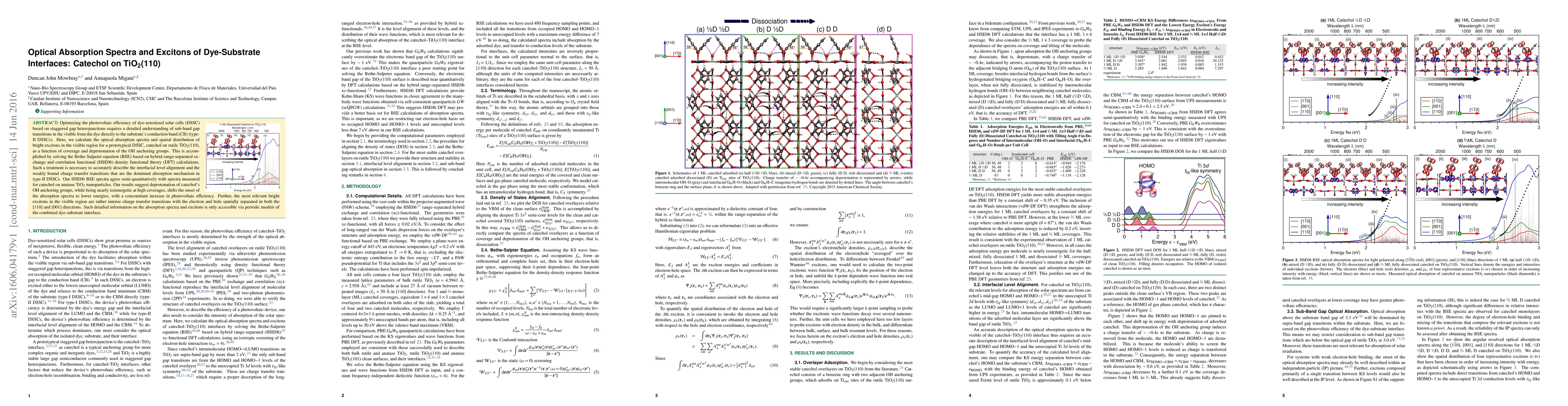 This study investigates the optical absorption spectra and excitons at the catechol on TiO$_2$(110) interface using hybrid functional theory and the Bethe-Salpeter equation, revealing that deprotonation of OH groups shifts absorption to lower energies and enhances photovoltaic efficiency in type-II dye-sensitized solar cells.